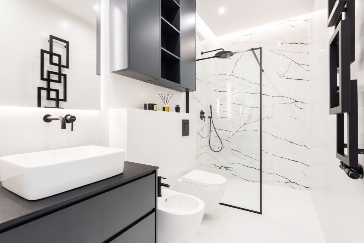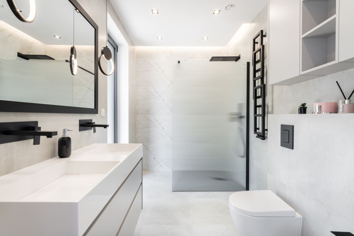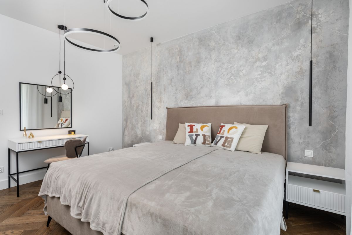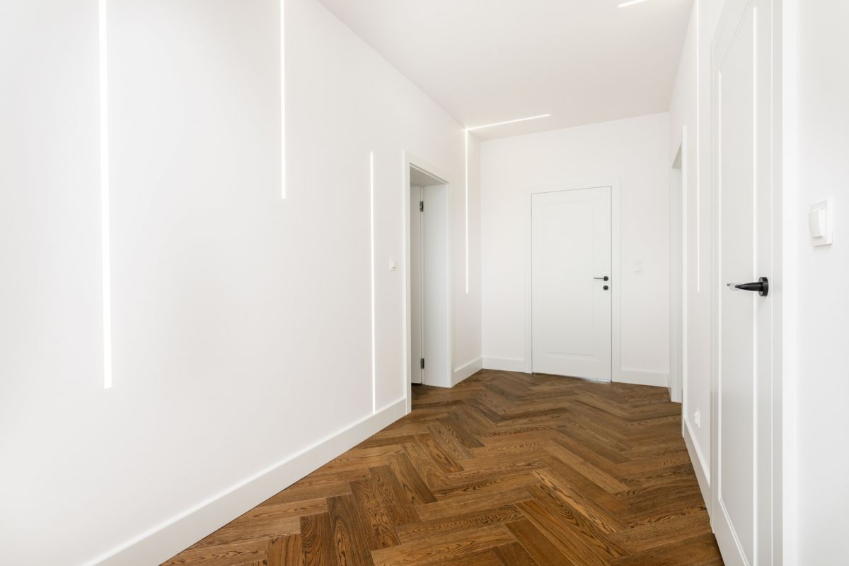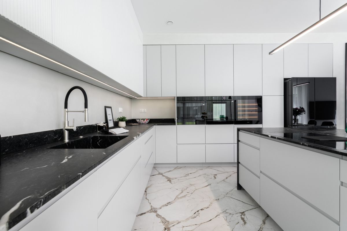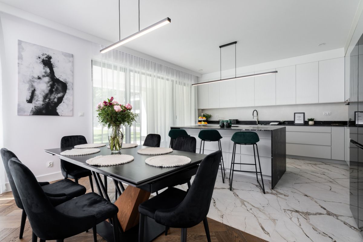 Dom wykończono w standardzie premium: dębowe podłogi ułożone w jodełkę, aluminiowa stolarka okienna, przesuwne systemy HS, kuchnia i zabudowy wykonane na wymiar, sprzęt AGD najwyższej klasy, wielkoformatowe gresy, granit oraz beton strukturalny. W salonie oraz sypialni master zainstalowano klimatyzację i telewizory.