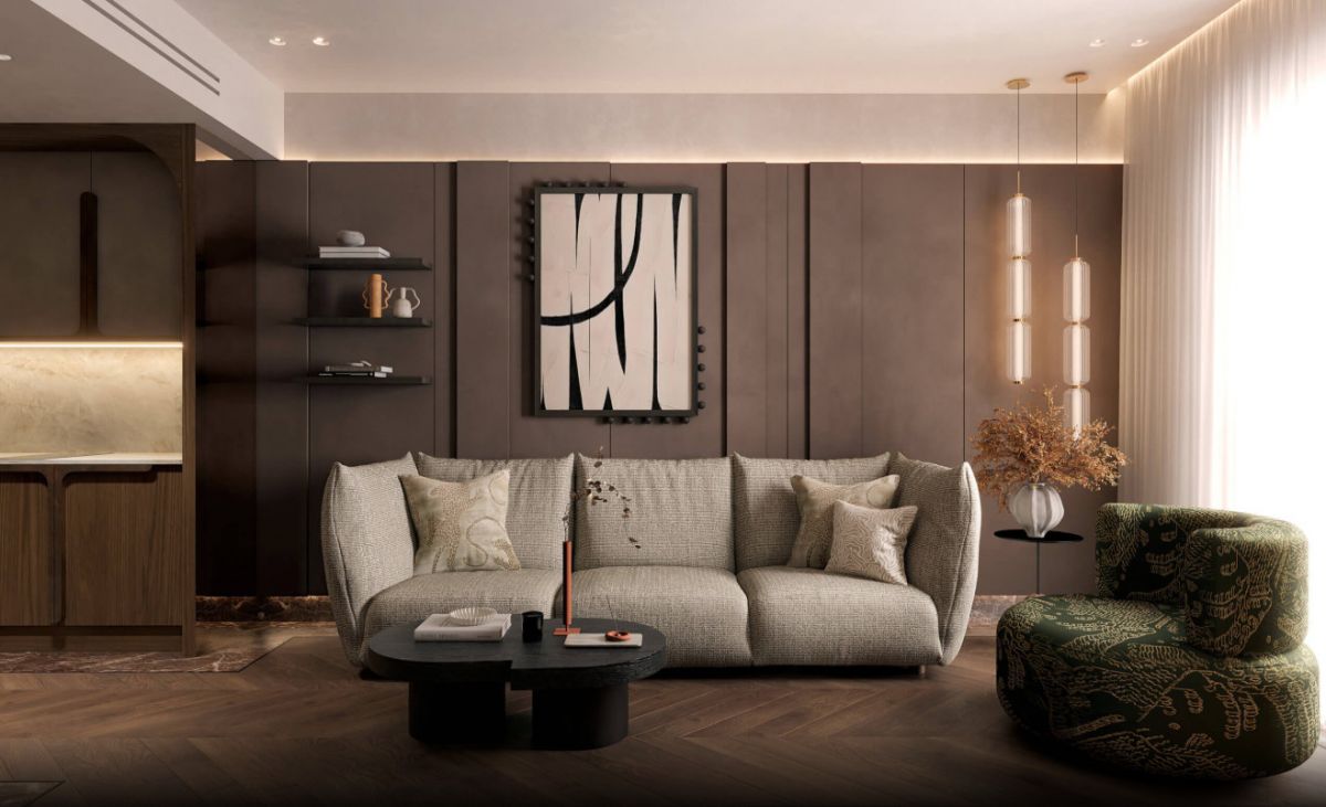 Wnętrza utrzymane są w eleganckiej stylistyce modernizmu i art déco – jasne tonacje drewna i kremowych tkanin kontrastują z ciemnym orzechem, antracytem i brązem, tworząc atmosferę wyrafinowanego luksusu.