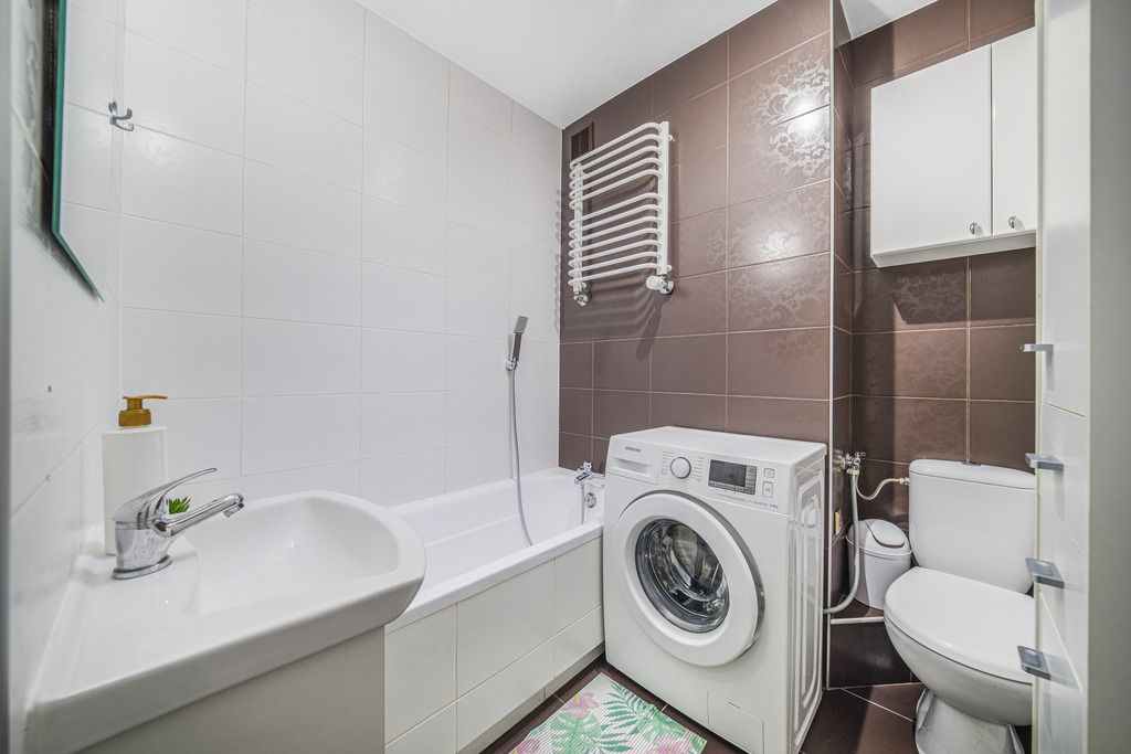 Łazienka z wanną mieści również umywalkę, toaletę, pralkę oraz dodatkowe szafki na kosmetyki i akcesoria.