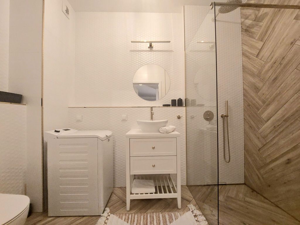 – łazienka – przestronna, z prysznicem, umywalką z okrągłym lustrem, toaletą i pralką. Piękne, złocone listwy i baterie dodają jej charakteru i elegancji.