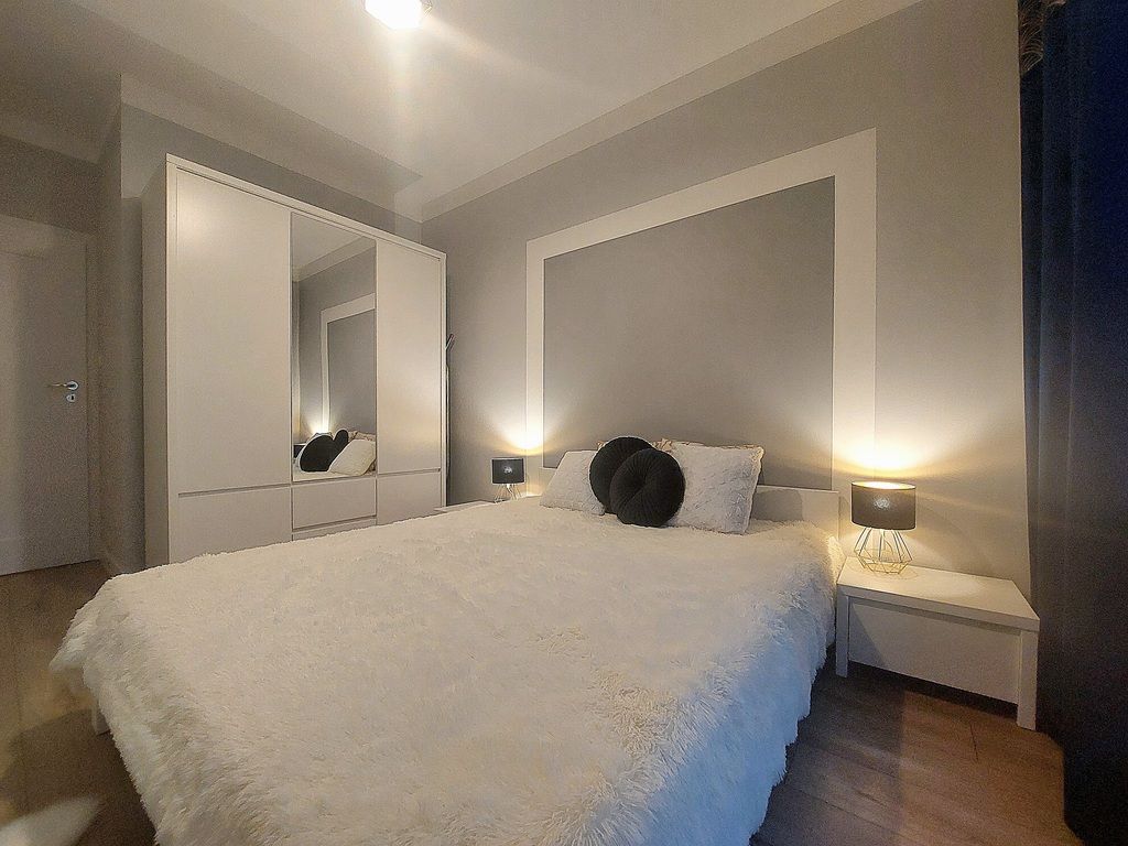 – sypialnia – utrzymana w odcieniach bieli i szarości, z granatowymi zasłonami, złoceniami i stylowymi lampami podkreślającymi charakter wnętrza. Znajduje się tu łóżko małżeńskie oraz pojemna szafa z lustrem.