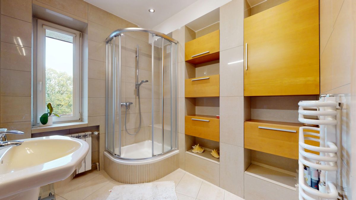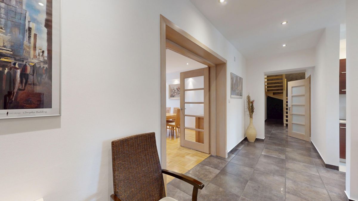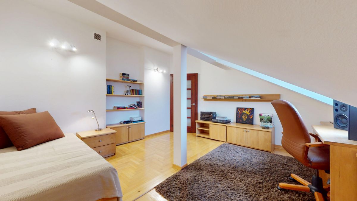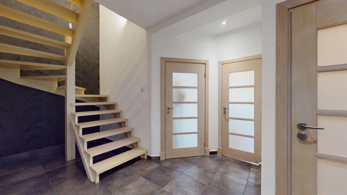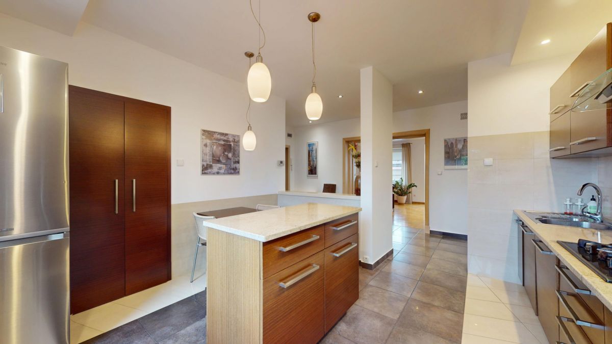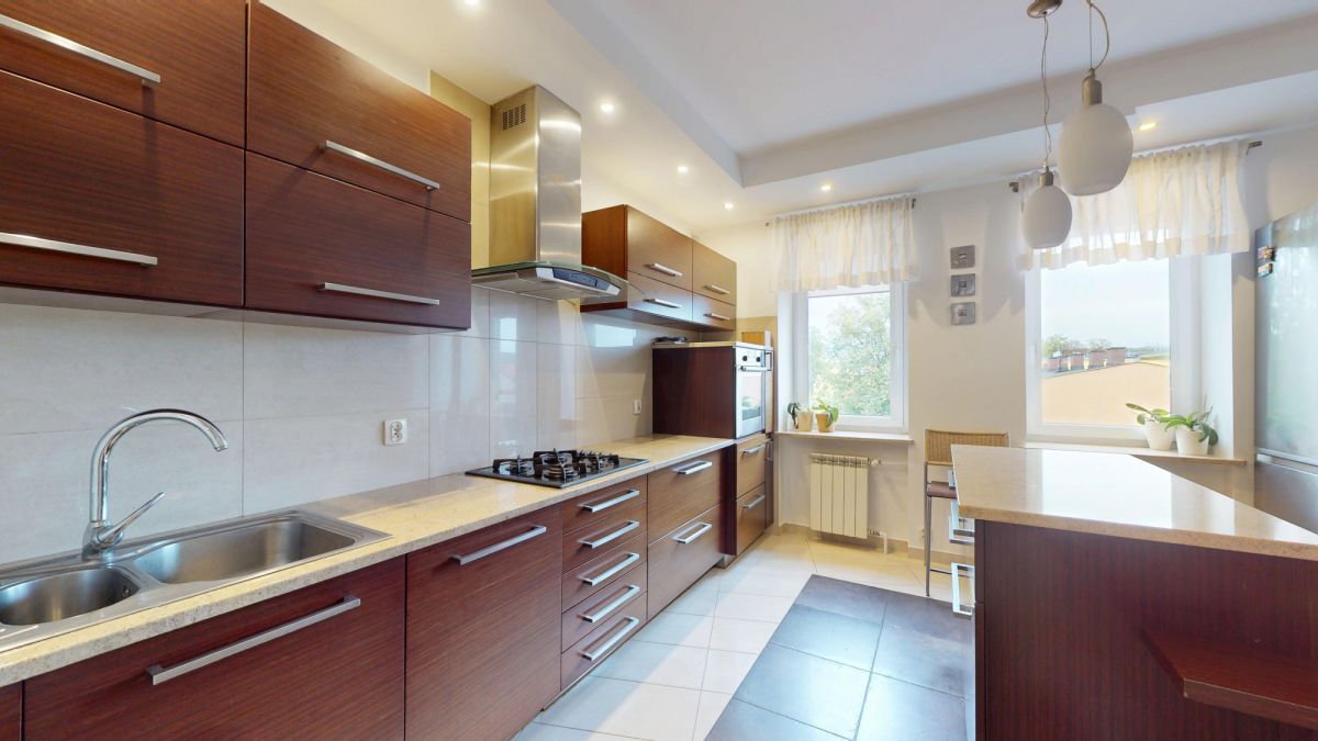 – ( I poziom o pow. ok. 126 m2 ): kuchnia z pomieszczeniem gospodarczym, salon (ok. 37 m²), trzy pokoje (po ok. 13 m²), łazienka z prysznicem, osobne WC;
