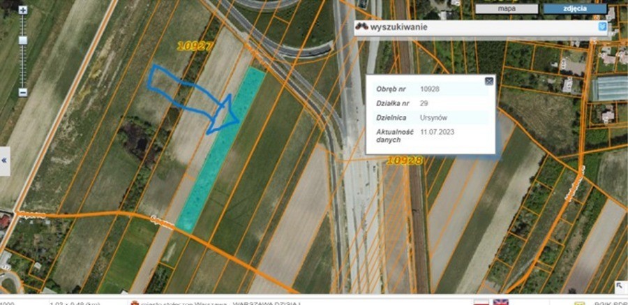 Działka pod usługi na Ursynowie 8 235 m2 pod MPZP (obręb 0927, 1-09-27, Warszawa gmina Ursynów). Okolica biznesowo/usługowa. Dojazd do działki asfaltem.