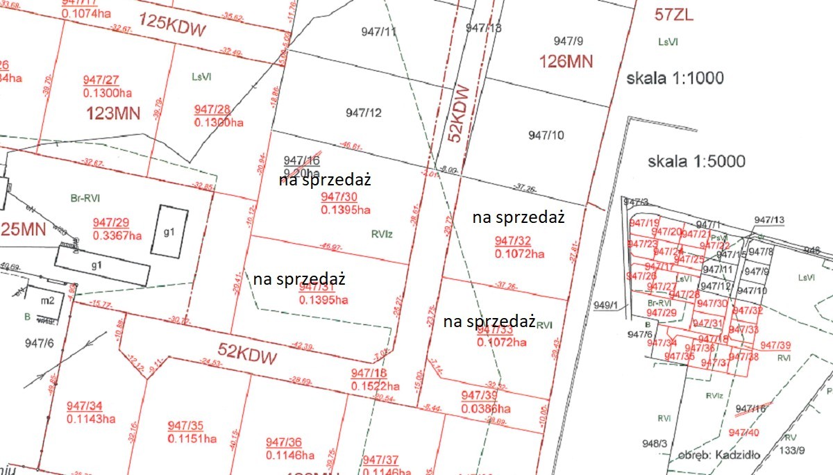 947/33 – około 1072 m² (ok. 23,75 × 29,43 m) Cena: 100 000 zł