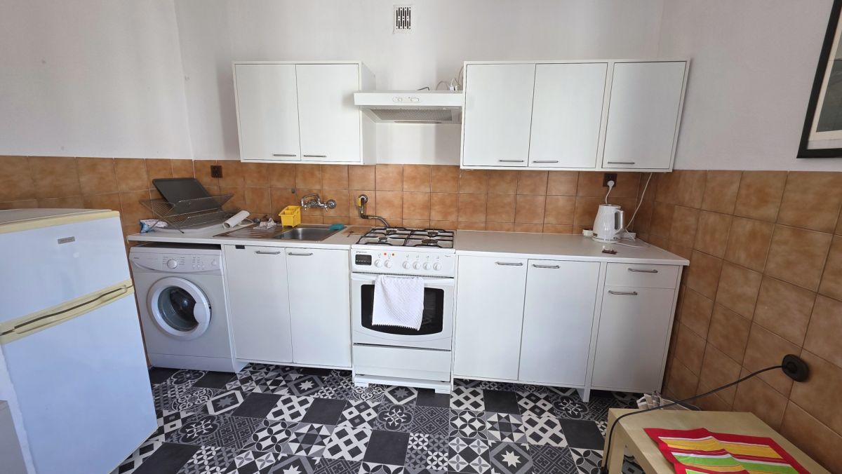 – kuchni bez okna otwartej na salon, wyposażonej w zabudowę szafkową, lodówkę, pralkę, kuchenkę gazowo/elektryczną, w części jadalnej stołu z krzesłami,