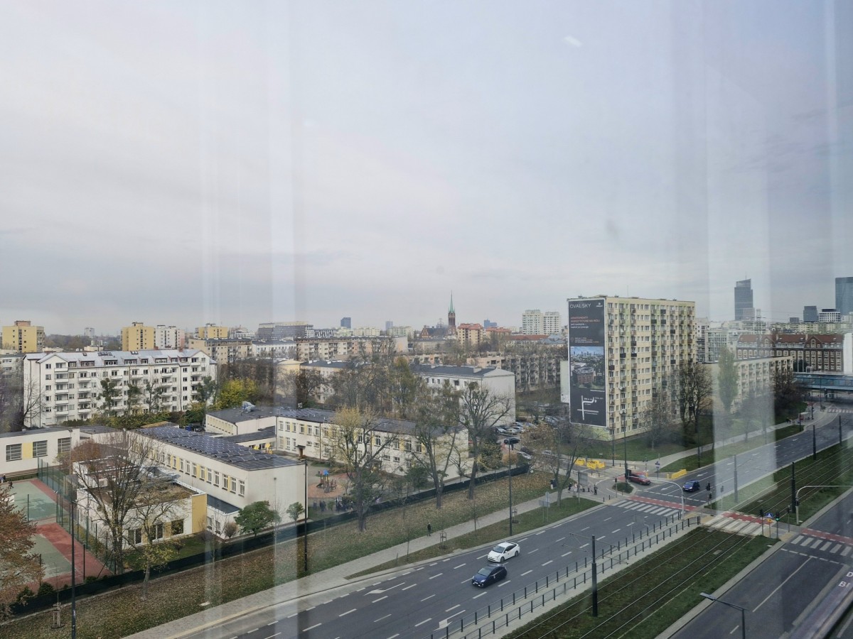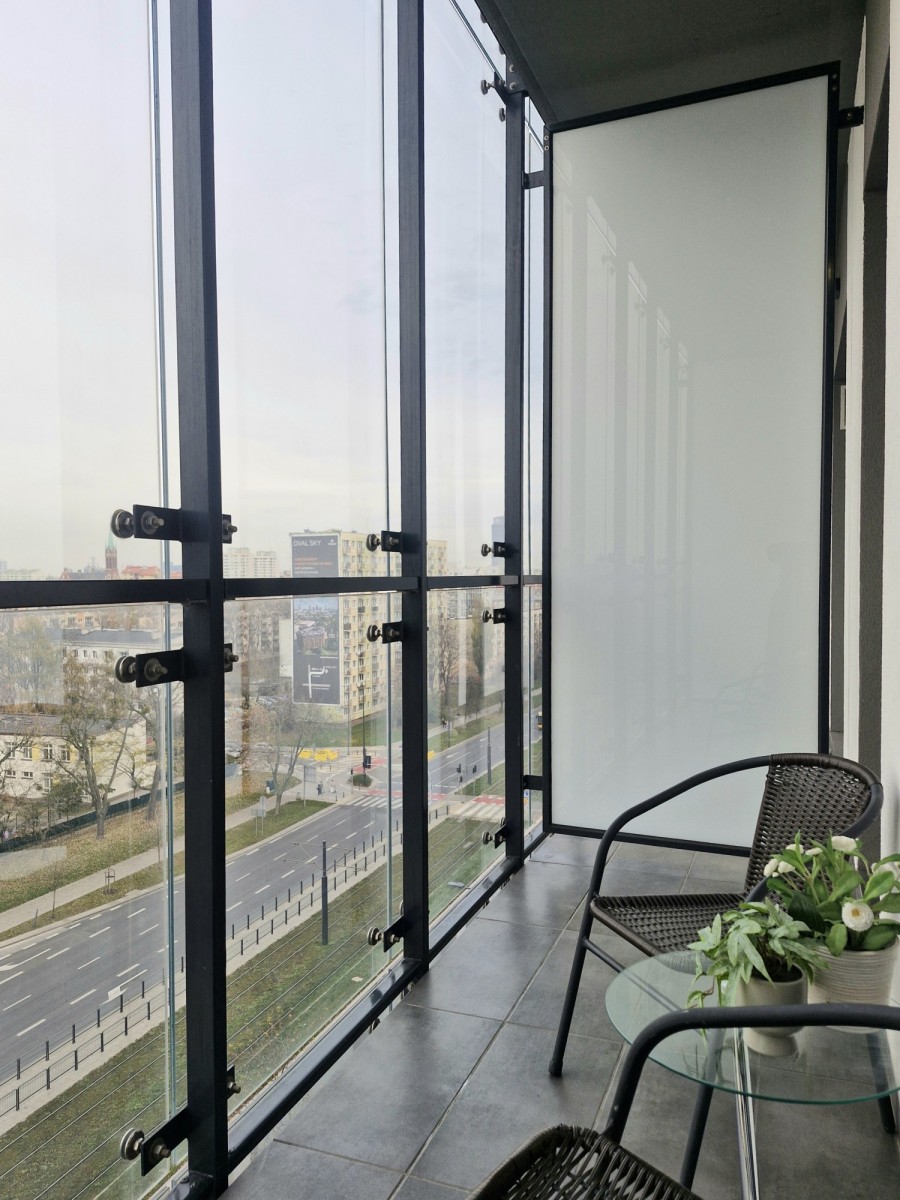 Przestronna loggia z widokiem na panoramę Warszawy, idealna na relaks i odpoczynek.