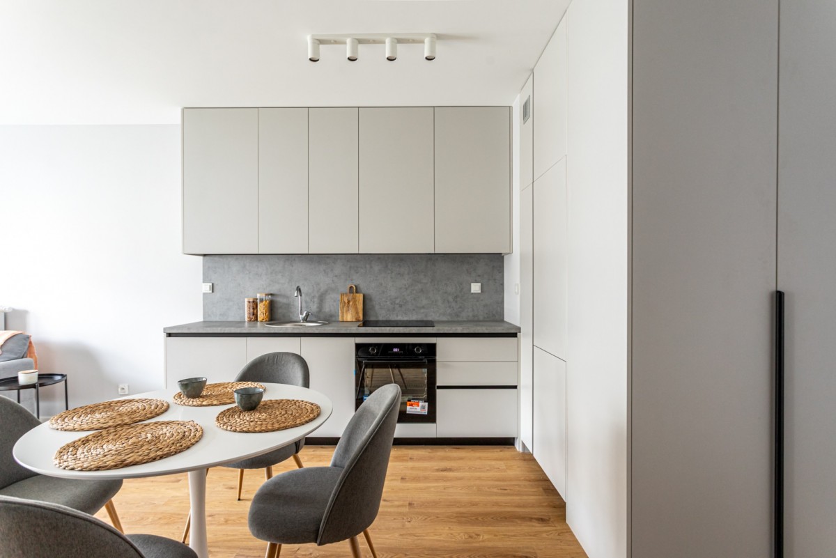 - przestronnego salonu z otwartą, w pełni wyposażoną w nowoczesny sprzęt AGD kuchnią
