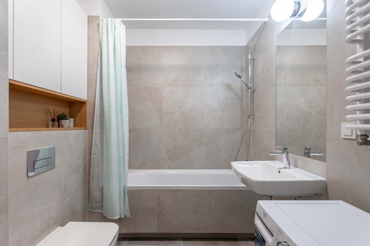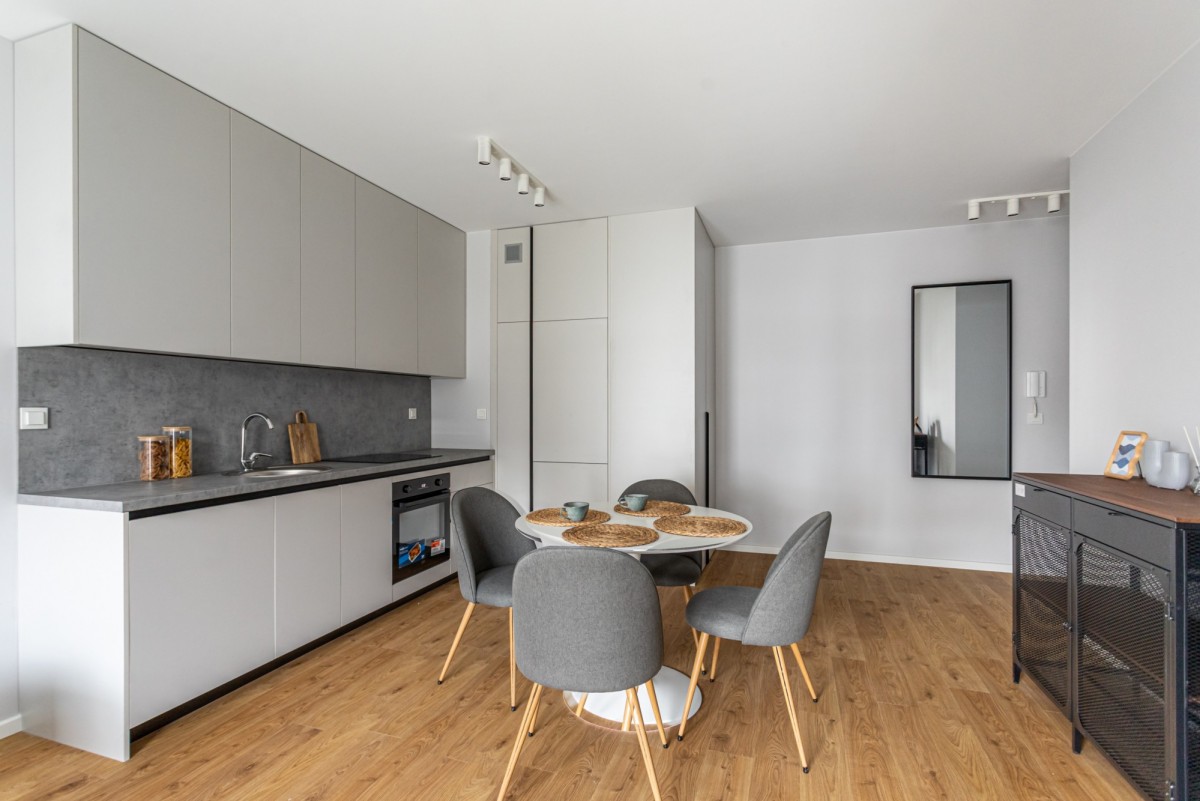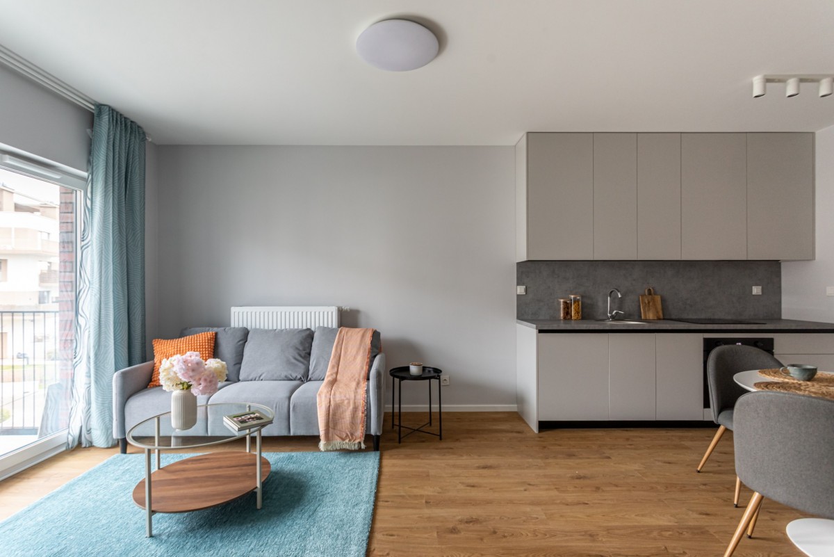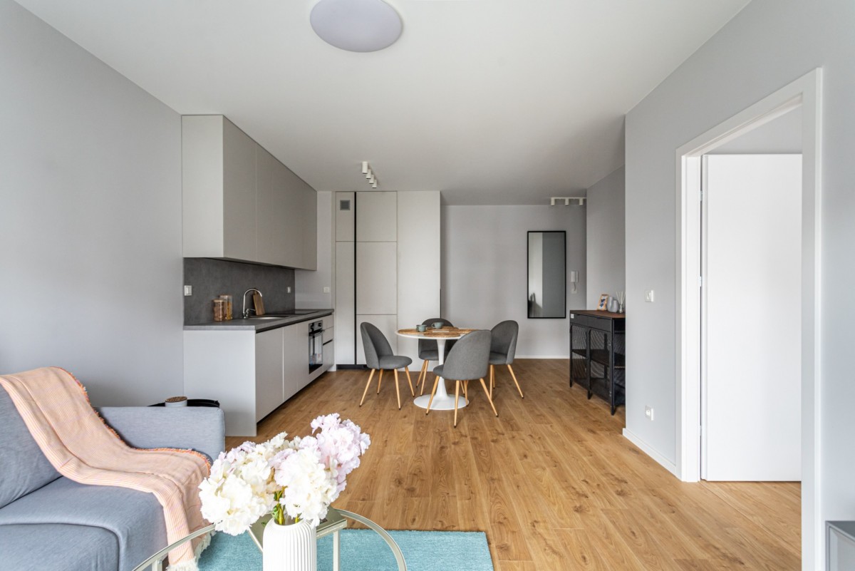 Prezentowane mieszkanie to przytulna i jasna przestrzeń, w której połączono funkcjonalność z nowoczesnym designem. Drewniana podłoga i naturalne światło tworzą ciepłą atmosferę, a balkon z widokiem na zieleń osiedlową pozwala na relaks na świeżym powietrzu.