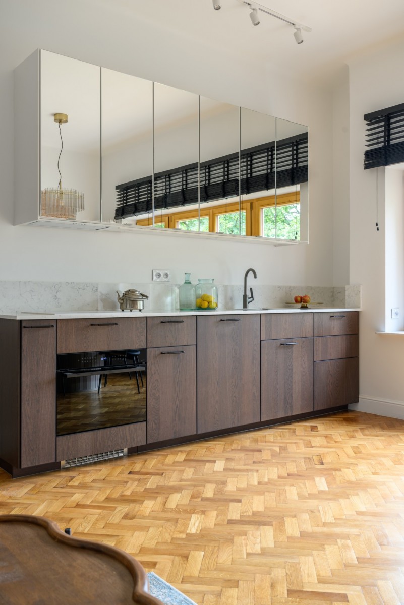 Mieszkanie usytuowane jest na drugim piętrze, po generalnym remoncie, gotowe do wprowadzenia dla pierwszego najemcy. Apartament zachwyca wysokością pomieszczeń przekraczającą 3 metry, co nadaje mu niezwykłej przestronności. Styl wykończenia łączy przedwojenny charakter kamienicy z nowoczesnym designem i wygodą. Salon oraz główna sypialnia zostały umeblowane w minimalistycznym stylu, który podkreśla elegancję całości. Kuchnia w zabudowie i wyposażona we wszystkie urządzenia AGD – (lodówkę, zmywarkę, piekarnik oraz płytę indukcyjną).