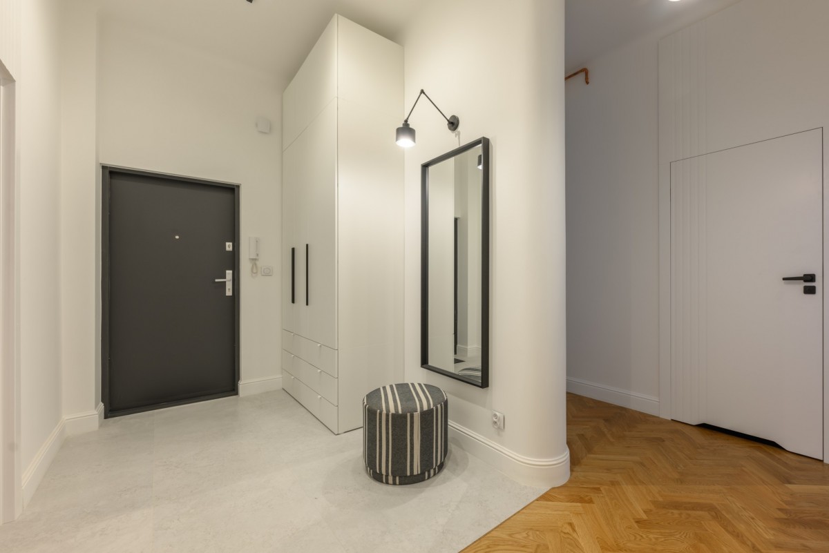 Na komfort codziennego życia wpływają także nowe, drewniane okna trzyszybowe, klimatyzacja oraz balkon. Drewniana podłoga w klasyczną jodełkę nadaje wnętrzom eleganckiego charakteru, a starannie dobrane meble i oświetlenie podkreślają wyjątkowy klimat mieszkania.