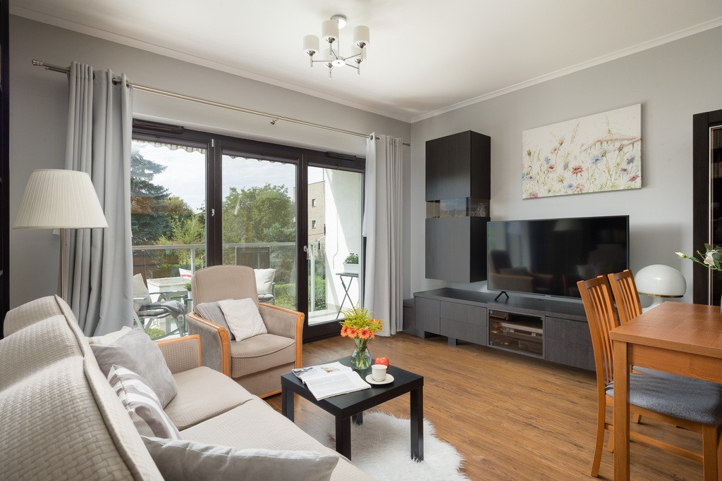 A spacious apartment with a balcony in a well-maintained neighborhood in a green part of Mokotów at 71 Bartycka Street. Beautiful view from the balcony. A very well-maintained neighborhood with plenty of parking spaces for guests.