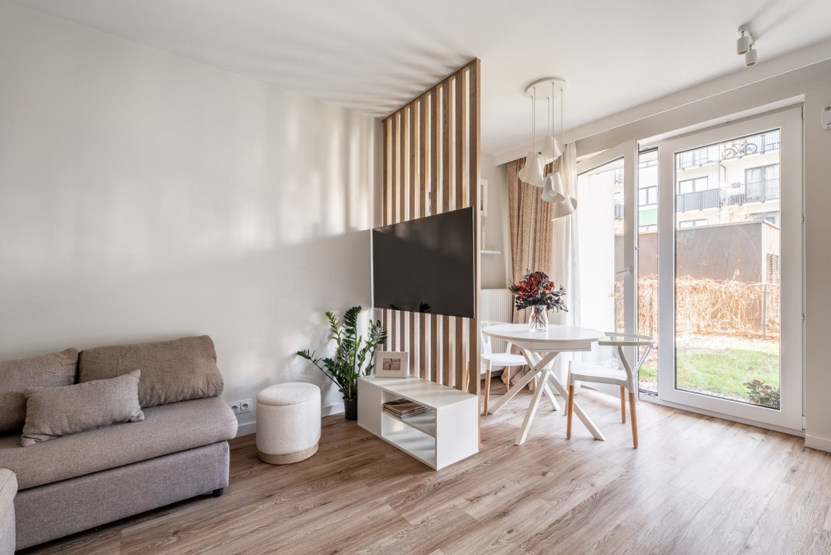 Mieszkanie o powierzchni 47 m² na parterze nowoczesnego budynku – salon z aneksem kuchennym 18 m²,