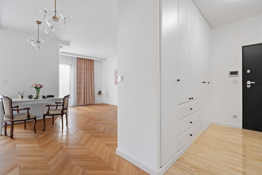 - Hol z zabudową na wymiar – maksymalna funkcjonalność od progu. Wydzielona garderoba została zaprojektowana pod wymiar, by pomieścić wszystko, co potrzebne – bez kompromisów i bez chaosu. Tu liczy się każdy centymetr.