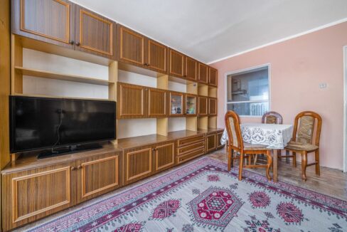 The living area is spacious and functional, featuring a sofa, coffee table, TV unit, and a dining table. From the living room there is access to a glazed balcony, which easily accommodates a table and chairs while still offering plenty of space.