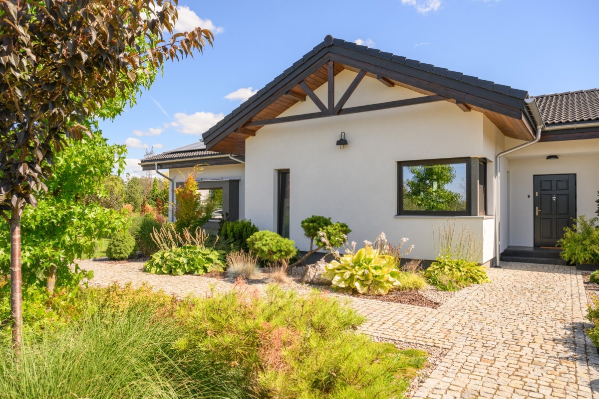 - Podjazd i chodniki: kostka granitowa 10×10 cm.