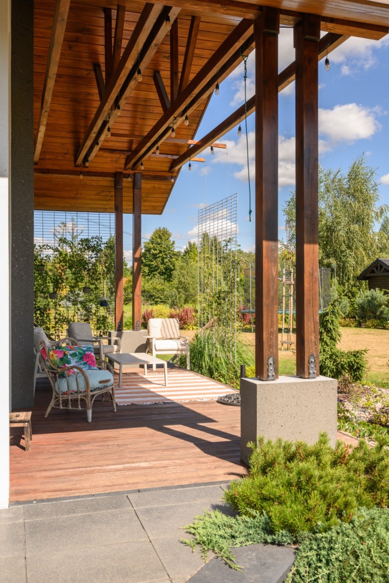 - Tarasy: betonowe z powierzchnią bazaltową oraz dwa z modrzewia syberyjskiego.