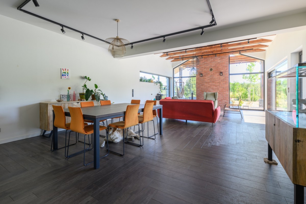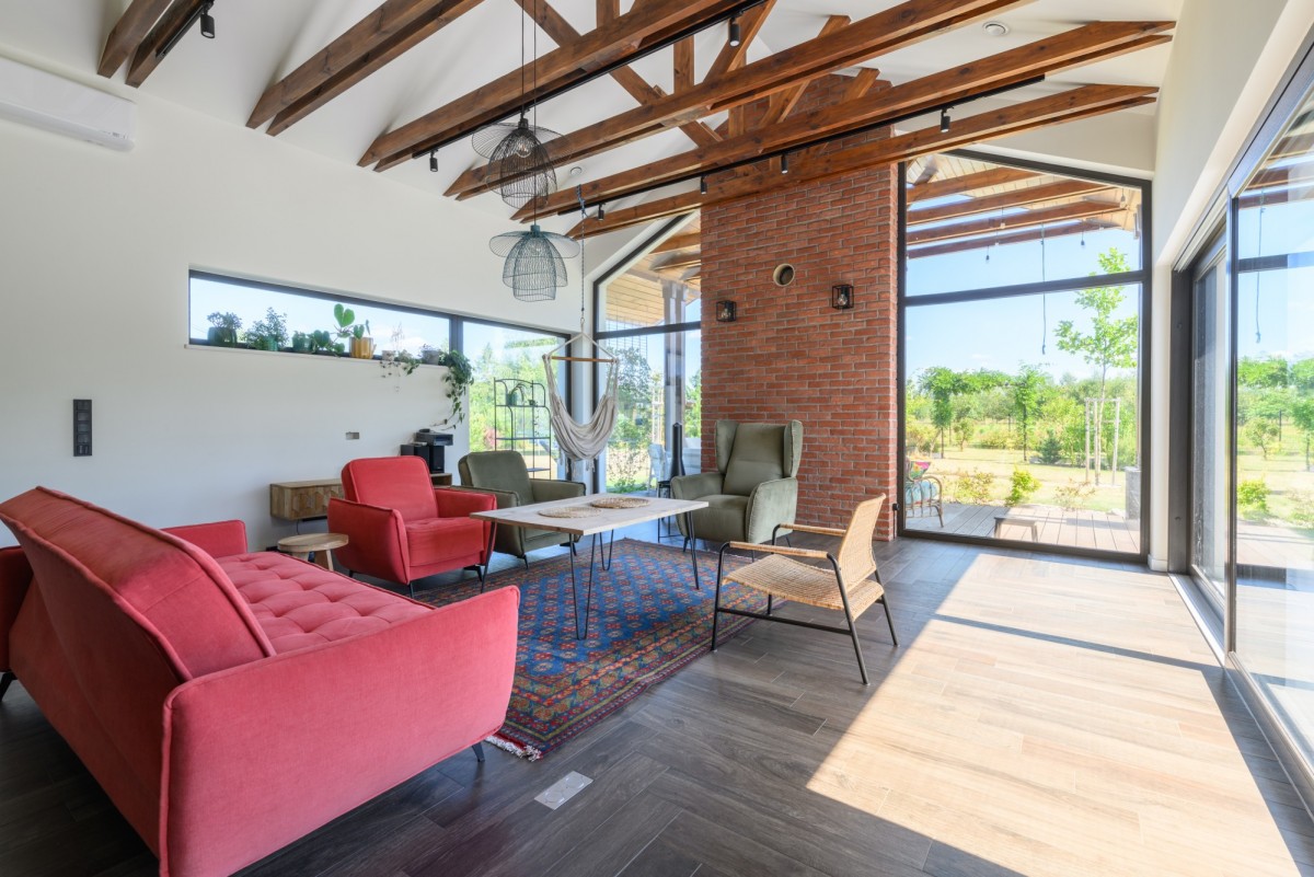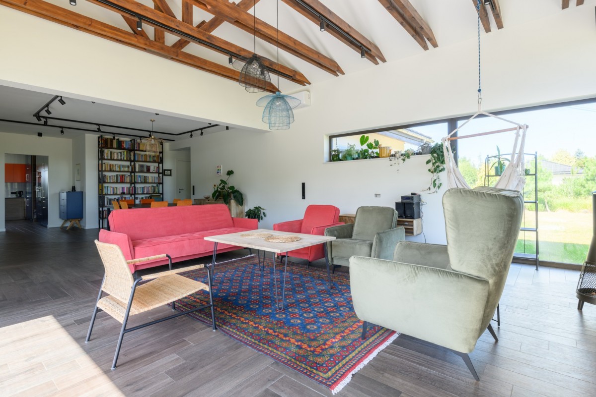 - Salon z jadalnią – ponad 65 m², imponująca wysokość, widoczne elementy konstrukcyjne dachu (jętki z drewna w kolorze ciemny orzech).