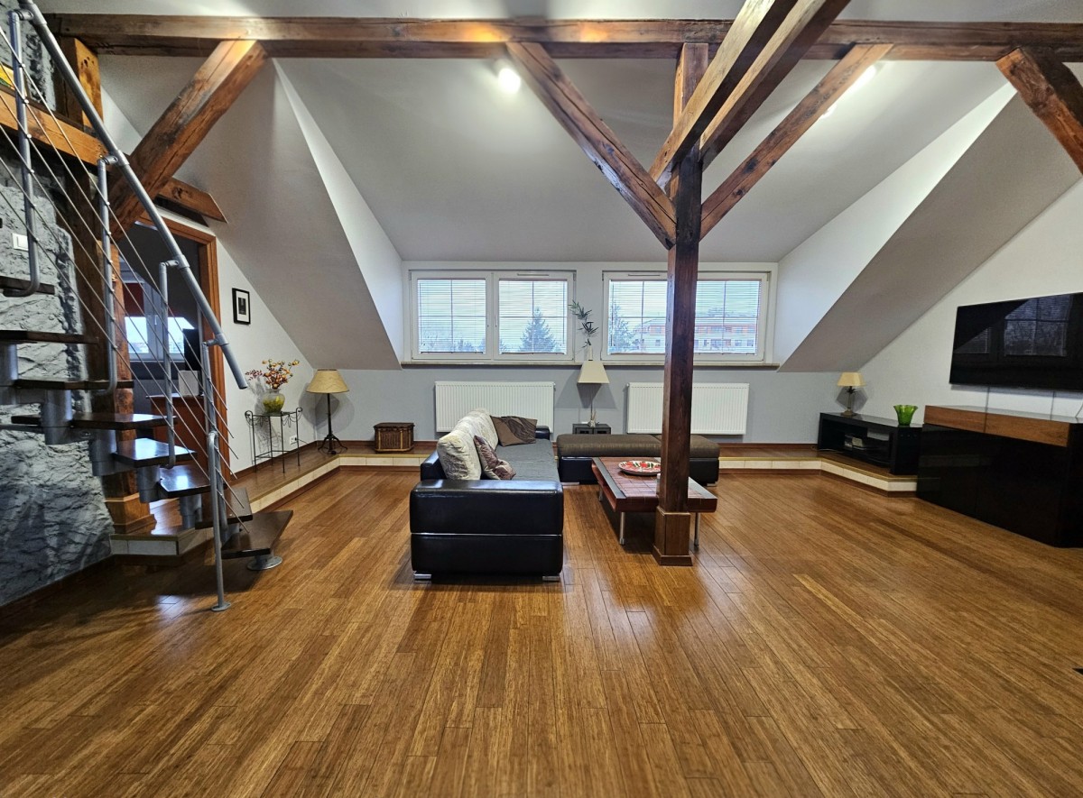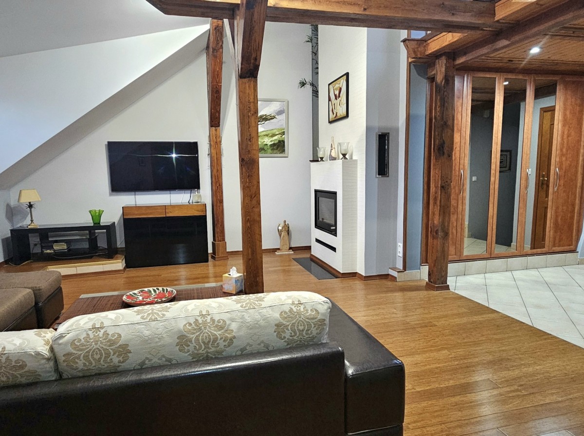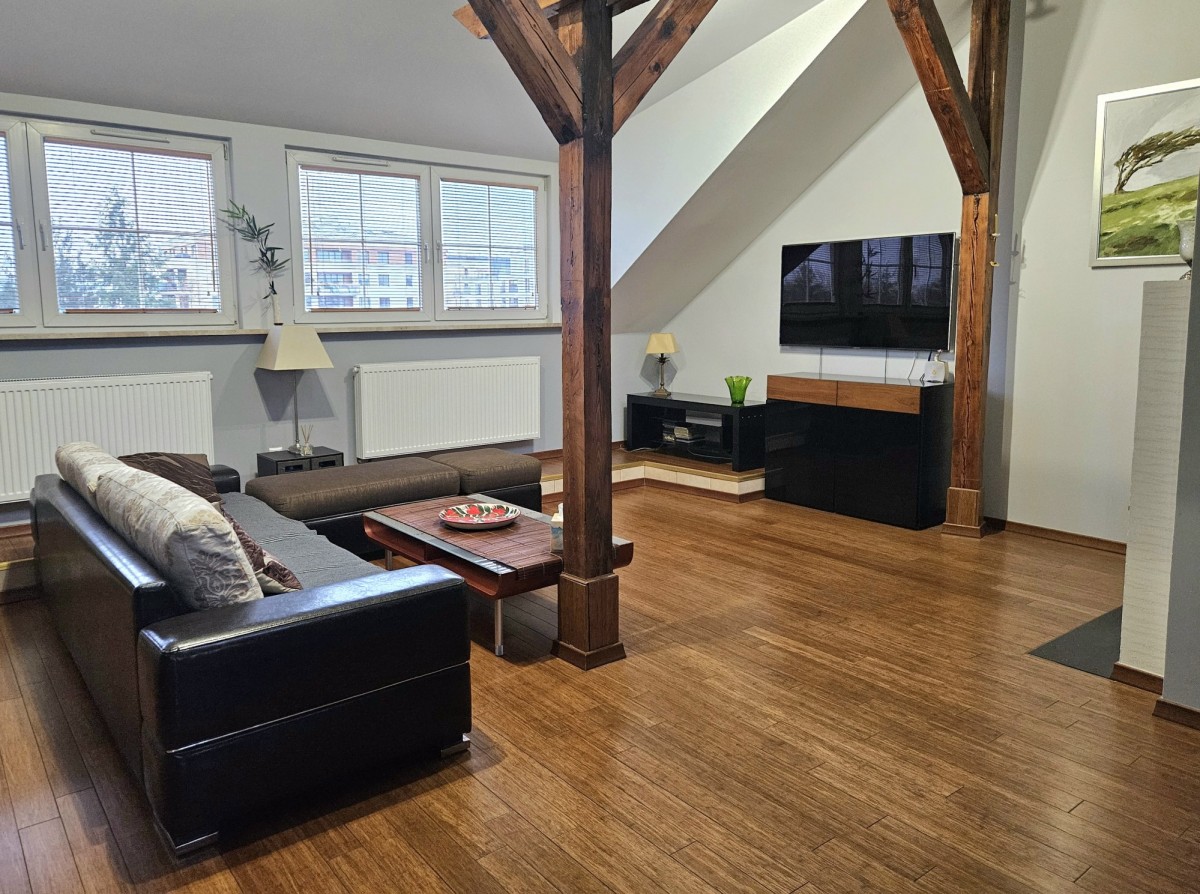 Dwupoziomowy apartament o powierzchni całkowitej 125 m² (95 m² w KW + 30 m² solidnej antresoli), powstały w wyniku kompleksowej adaptacji poddasza w 2007 roku.