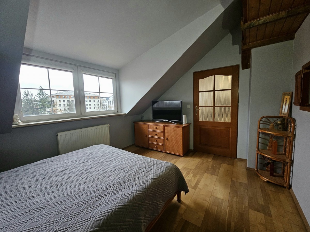 II Poziom (Antresola 30 m²): Solidna konstrukcja obecnie pełniąca funkcję gabinetu i miejsca wypoczynkowego, z możliwością wykorzystania jako dodatkowa sypialnia.