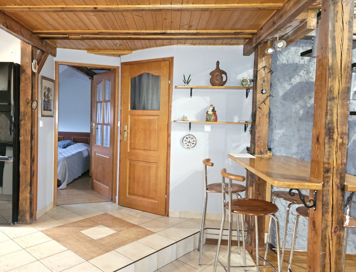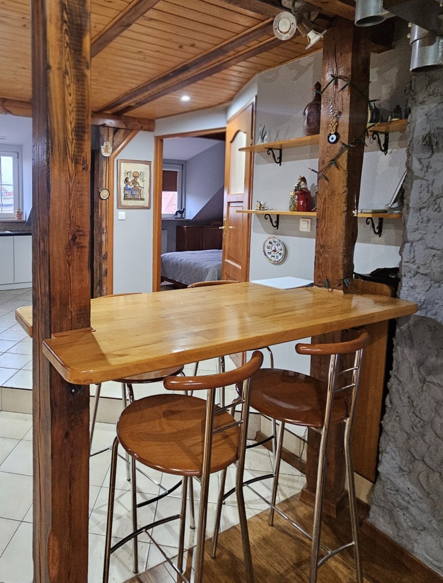 Wnętrze zachwyca niepowtarzalnym klimatem, który tworzą wyeksponowane oryginalne drewniane słupy i belki konstrukcyjne oraz otwarta przestrzeń. Dzięki temu lokal sprawia wrażenie samodzielnego domu usytuowanego na szczycie budynku.