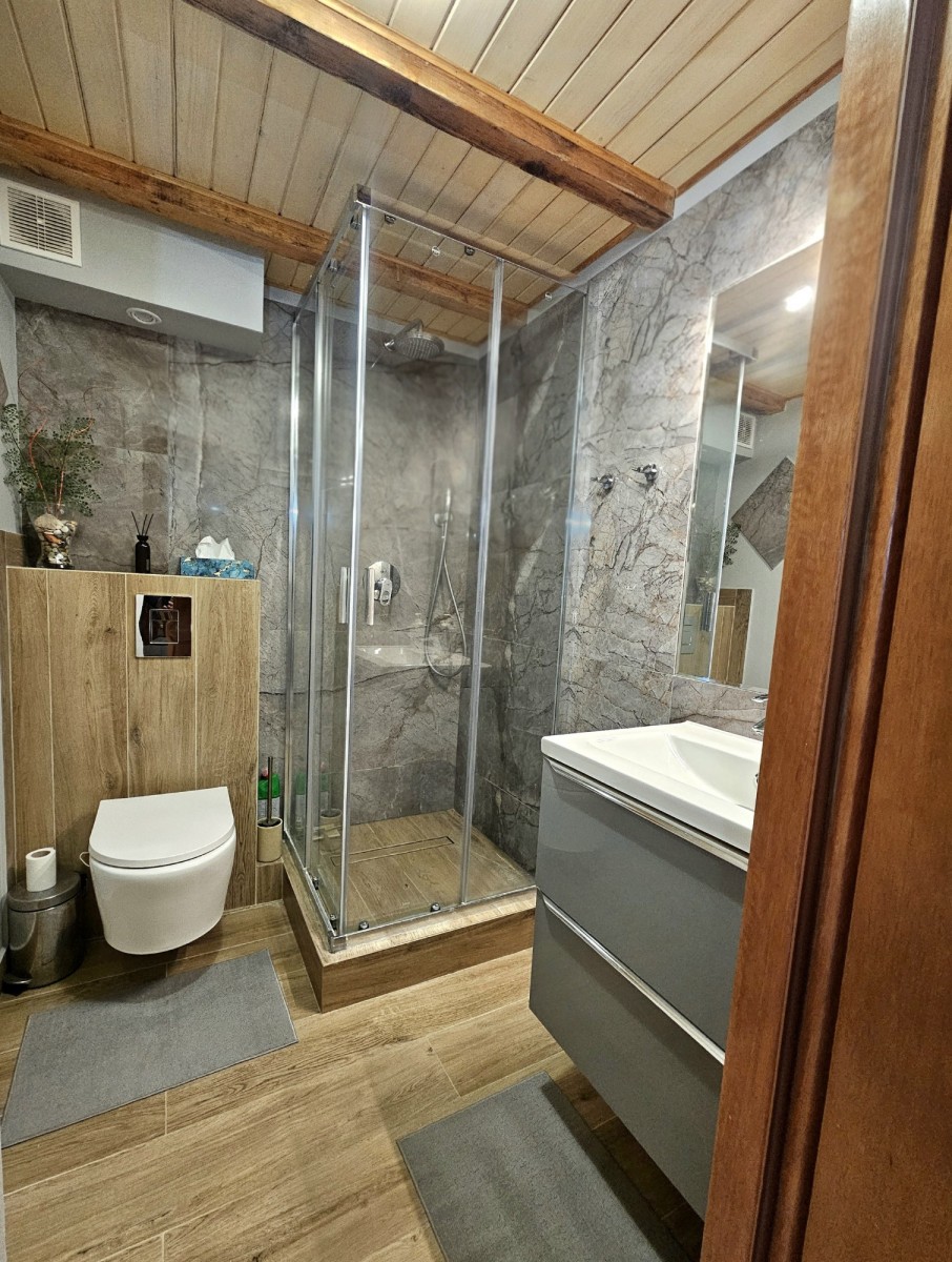 I Poziom (95 m²): Przestronny salon + hall (50 m²) z kominkiem, aneks kuchenny (5 m²), sypialnia (9 m²), główna sypialnia (10 m²) z prywatną łazienką (8 m², wanna i WC), druga łazienka z prysznicem (3 m²) oraz schowek (3 m²).