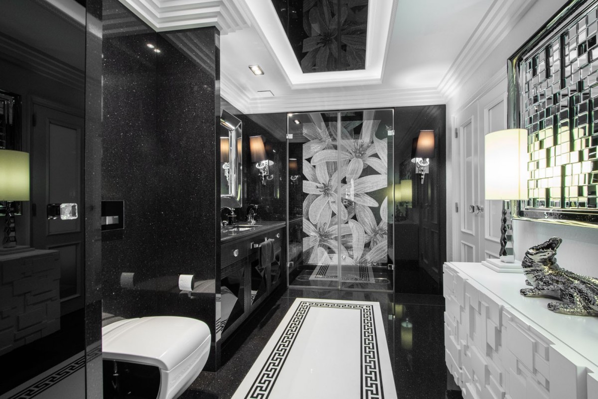 Perełką jest łazienka z centralnym punktem jakim jest prysznic z sauną parową wyłożony włoską mozaiką legendarnej firmy Antolini. Z łazienki możemy przejść do sypialni, gdzie łóżko oraz wszystkie dodatki zostały sprowadzone z Włoch. Całości dopełniają szafy tapicerowane materiałem z uchwytami wysadzanymi drobnymi kryształami.