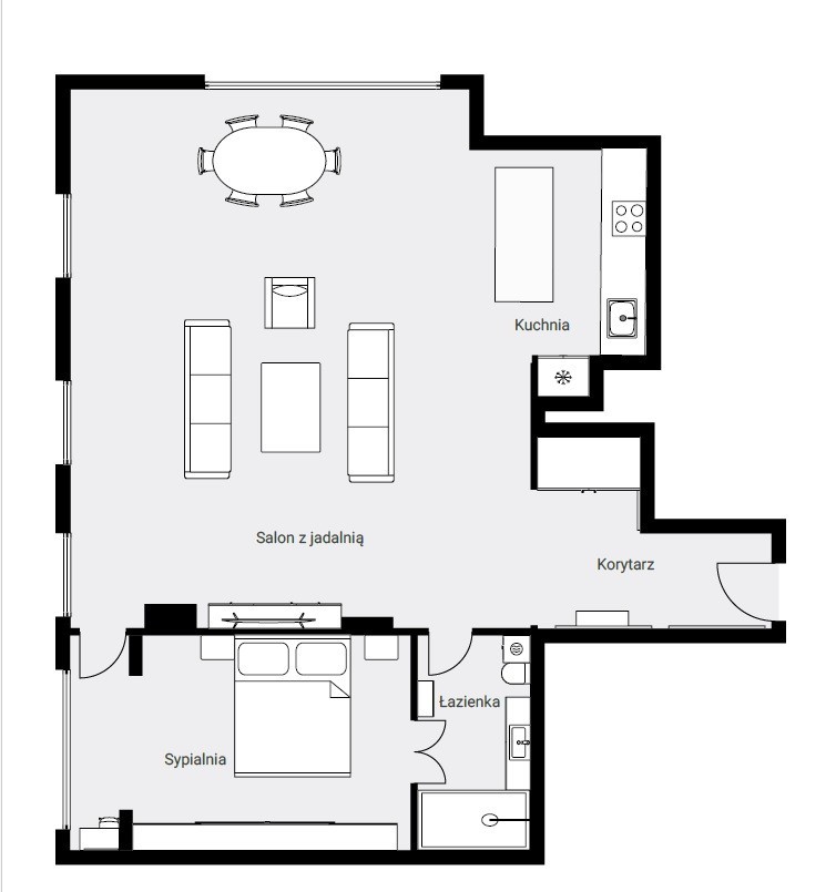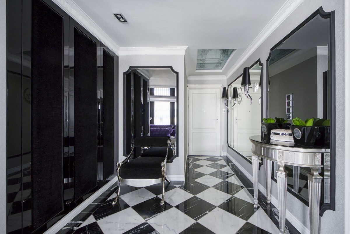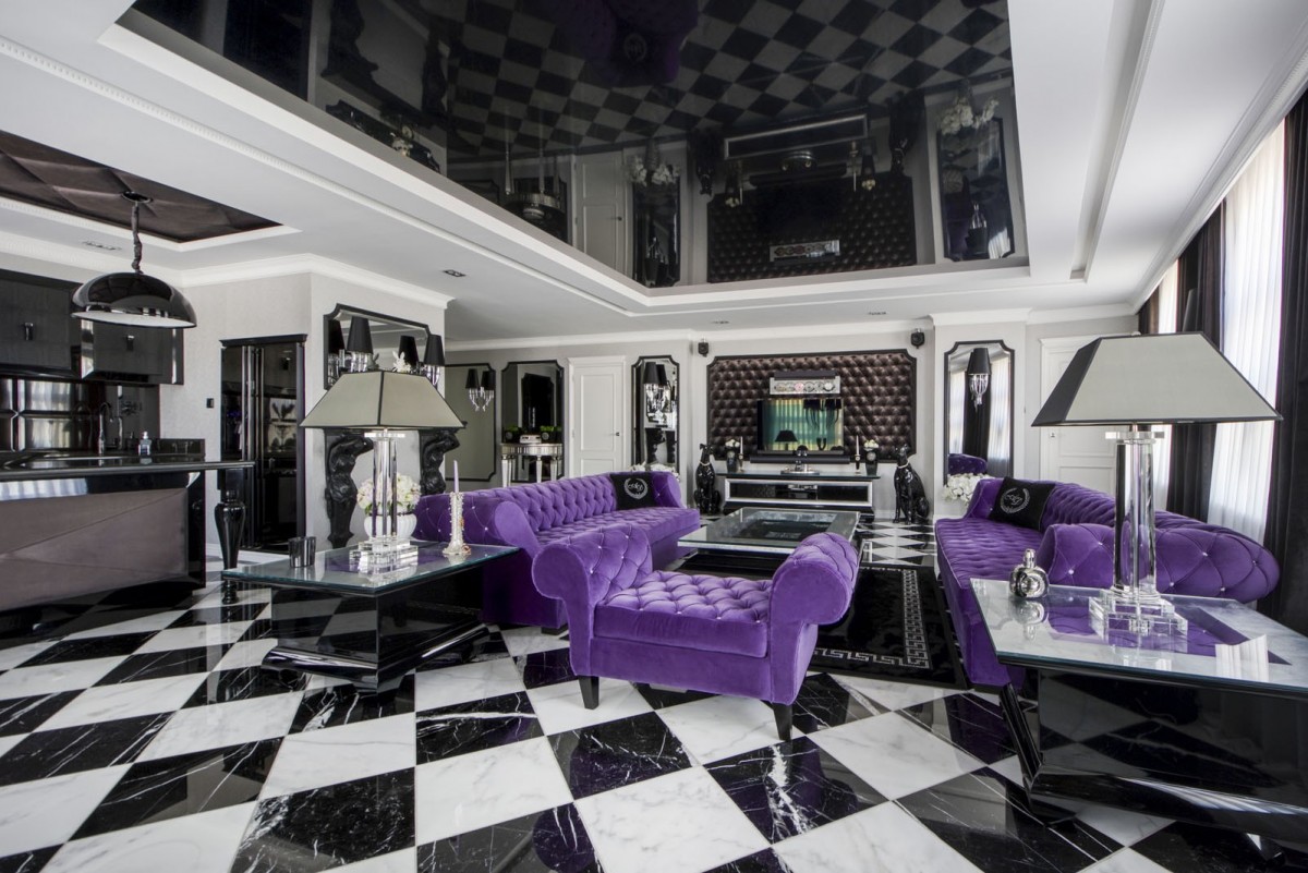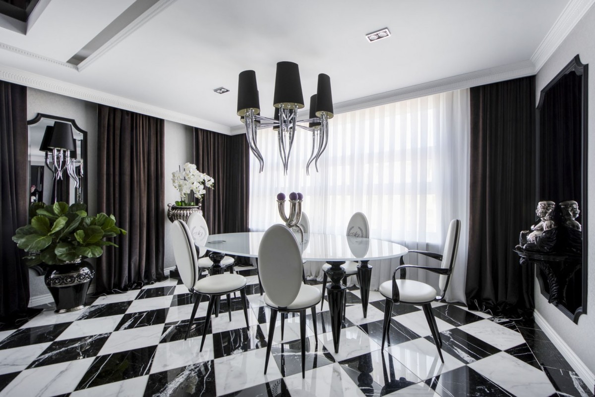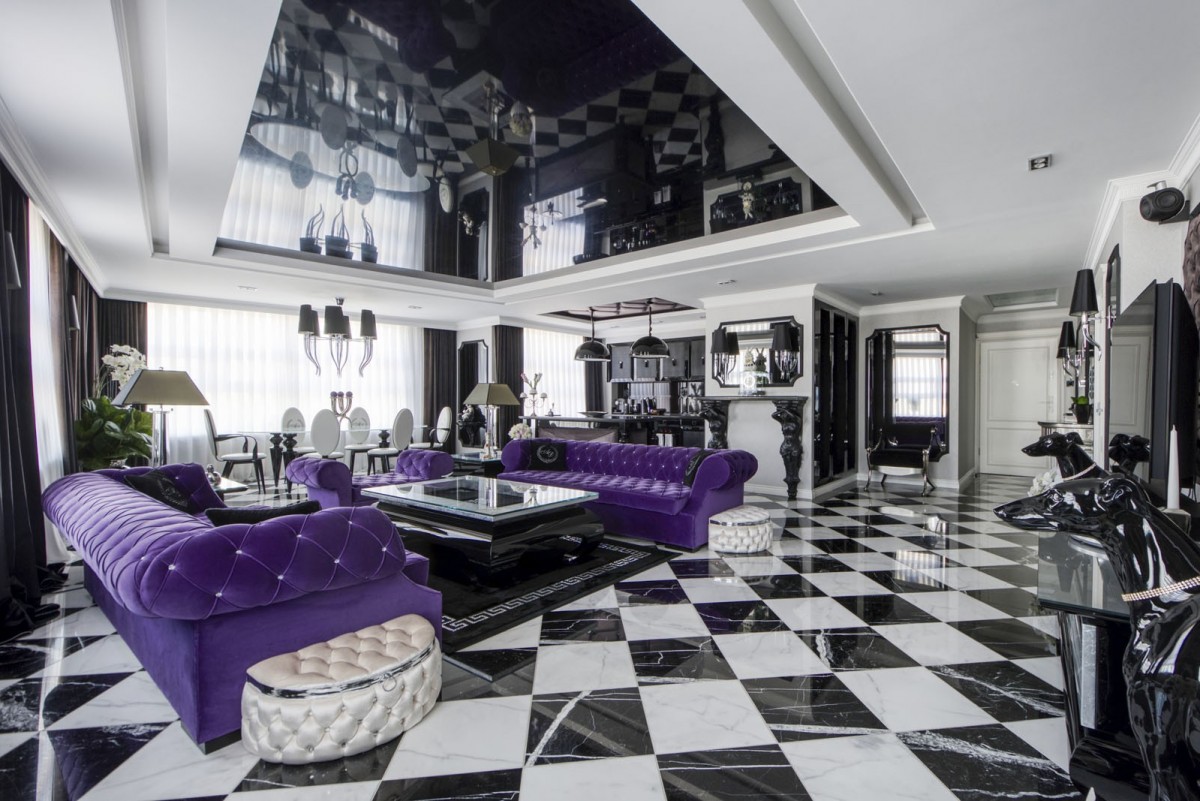 Centralnym punktem mieszkania jest przestronny (55m2) salon z kontrastowymi kanapami Moniki Kality, wykonanymi na zamówienie Właściciela. Dobrze doświetlony salon połączony jest z jadalnią, wyposażoną w piękny szklany stół z ceramicznymi nogami. Podłoga w całym apartamencie to włoski marmur, pod którym zainstalowano ogrzewanie podłogowe.