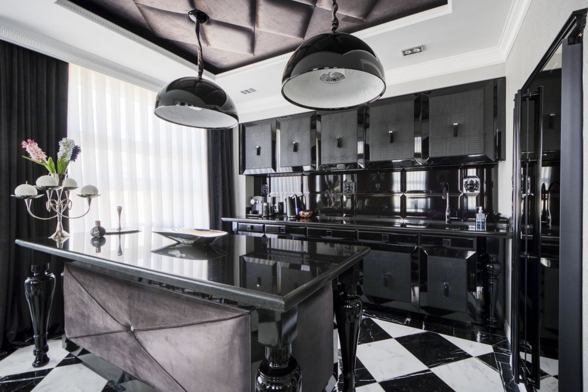 Sercem każdego domu jest kuchnia, szafki pokryte skórą oraz granitowe blaty podkreślają klimat apartamentu.