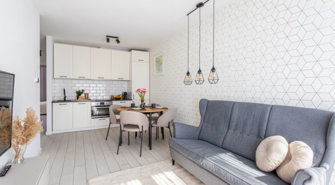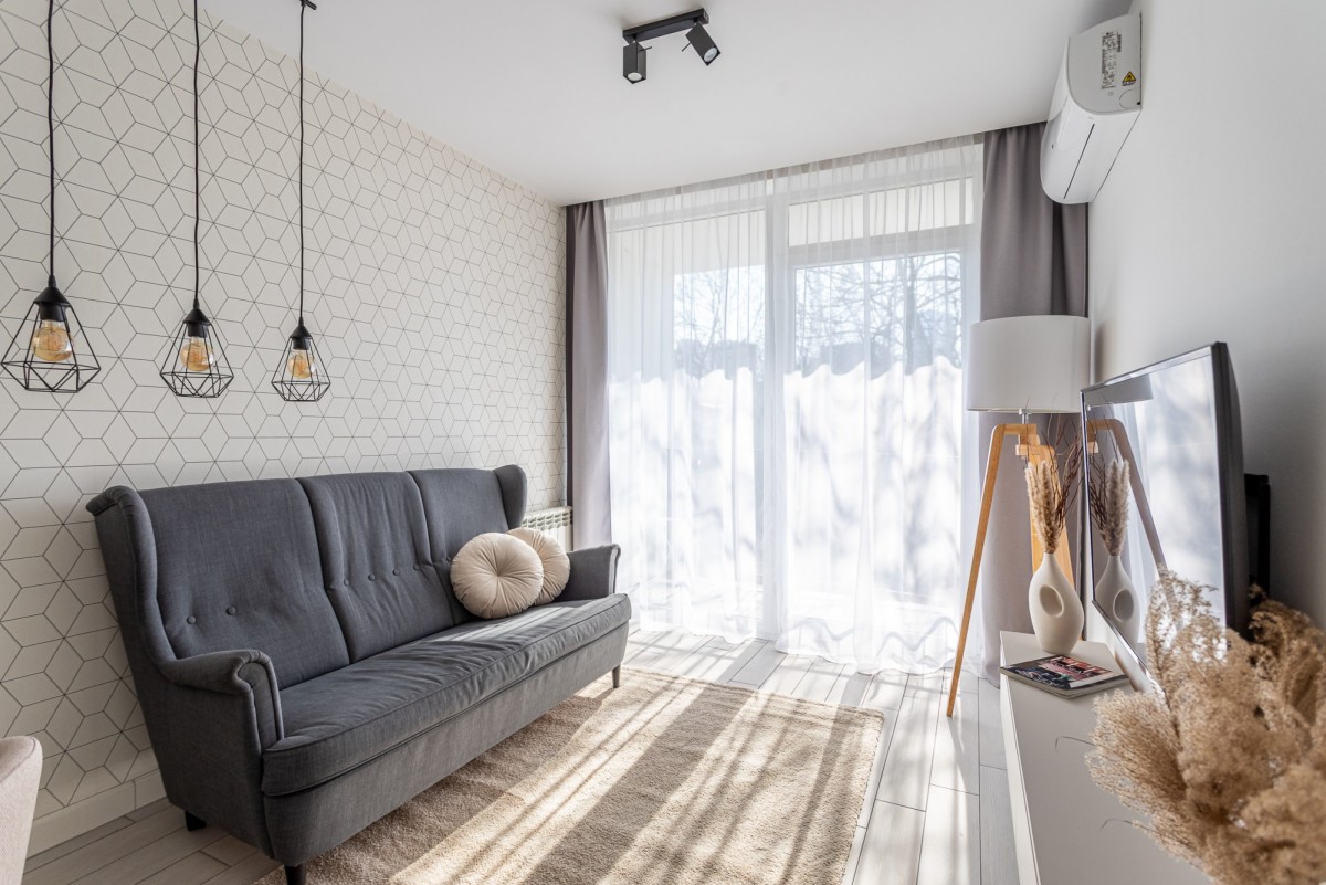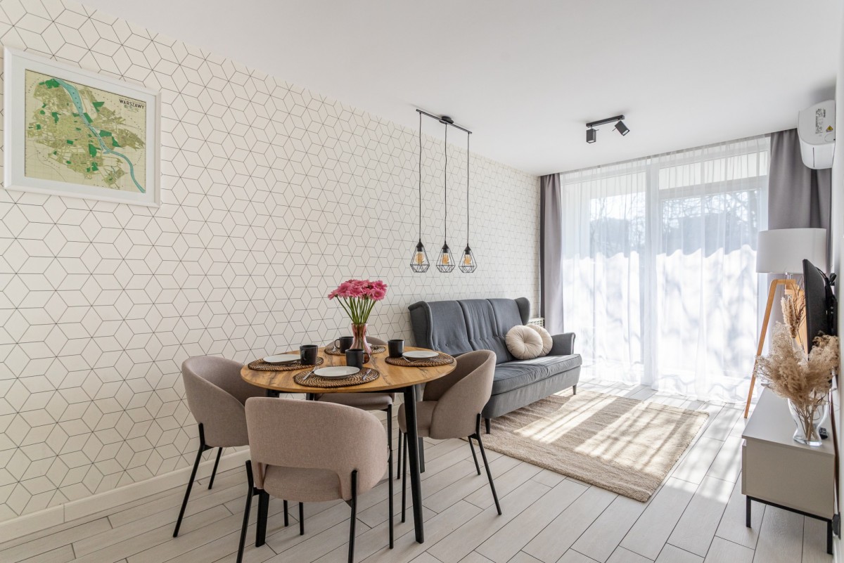 Kuchnia na wymiar (BRW) z lodówką, zmywarką, płytą indukcyjną, piekarnikiem z funkcją mikrofalówki i ekspresem do kawy. W każdym pokoju Smart TV (sypialnie: 3x 43’’, salon: 50’’), z dostępem do kablówki UPC. Całe wyposażenie (meble, telewizory, drobne sprzęty) dodatkowo w cenie 20 tys. PLN.
