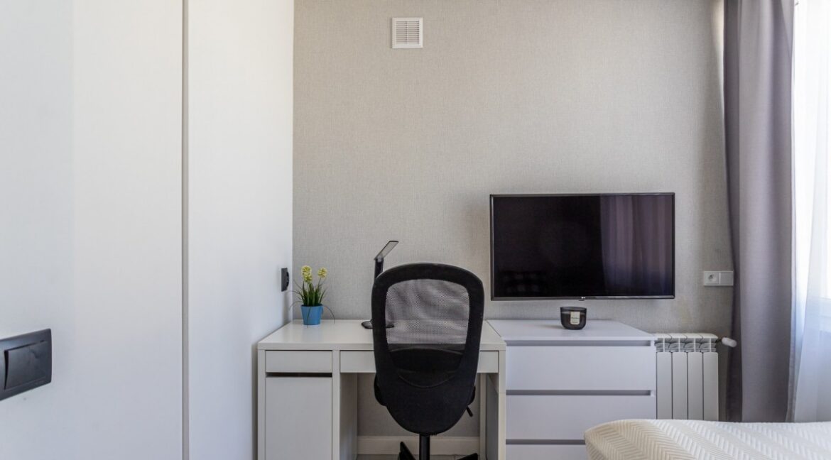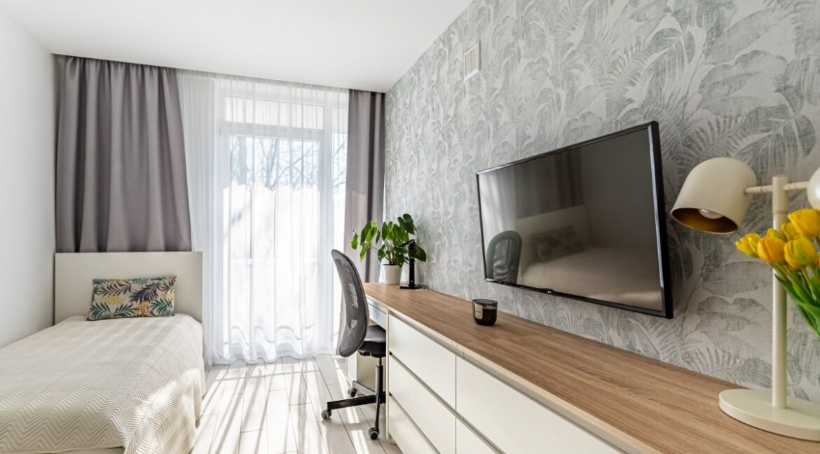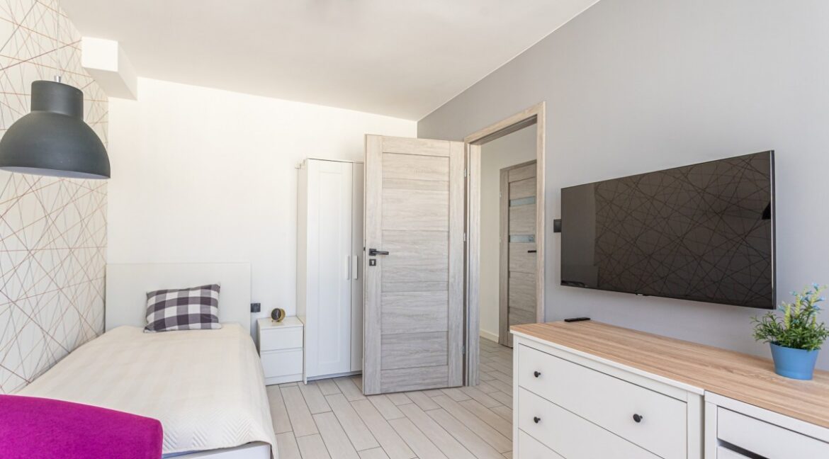 Każda z trzech sypialni jest wyposażona w łóżko, szafę, komodę, biurko z krzesłem oraz Smart TV.