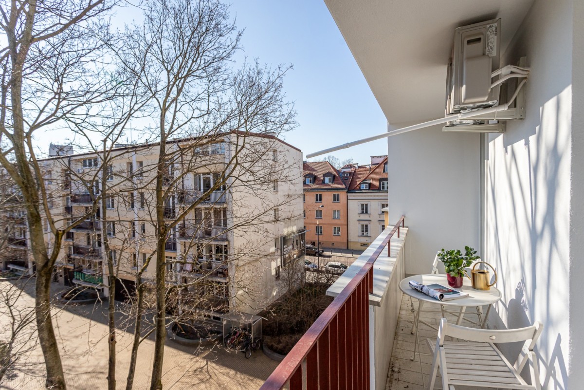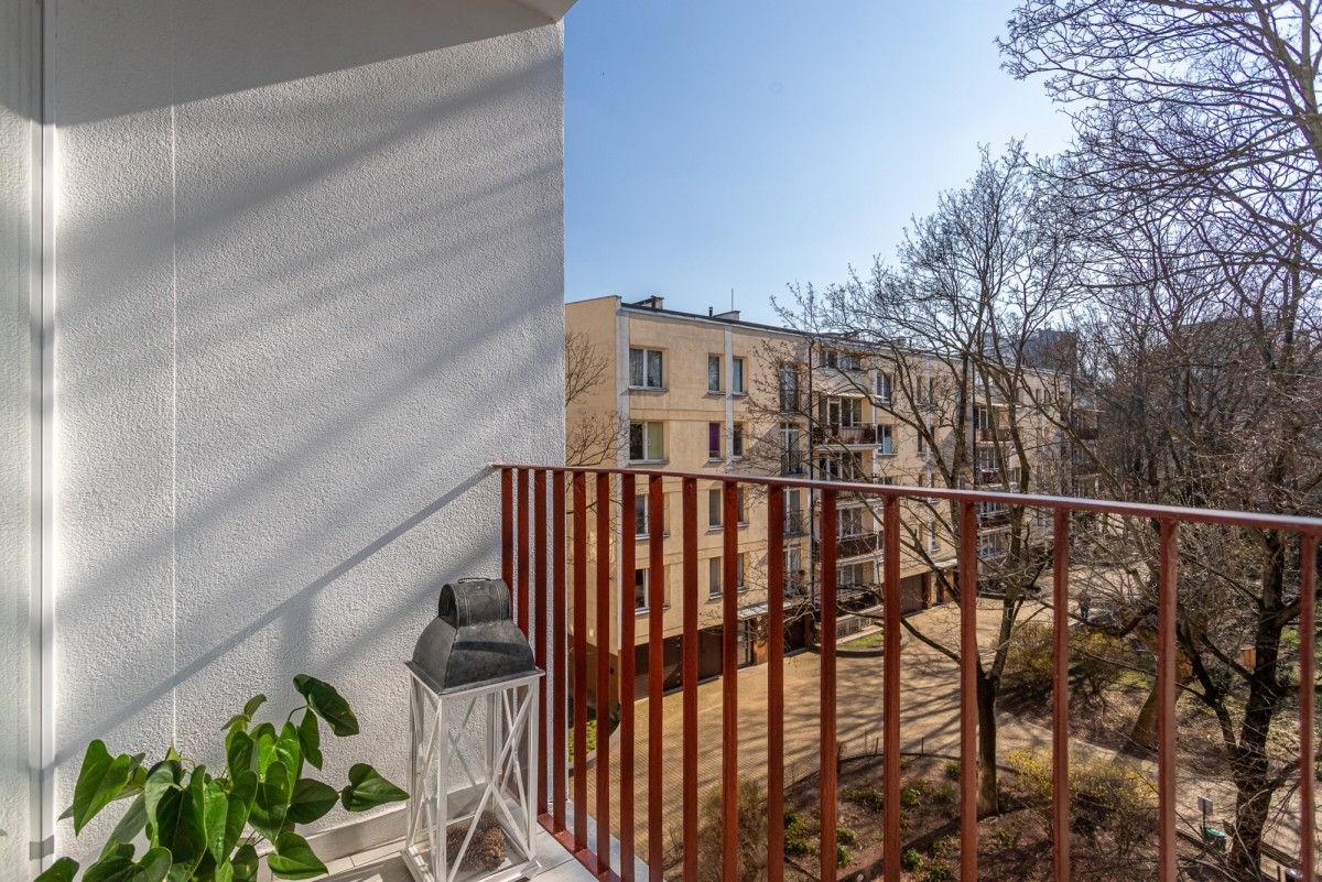 Mieszkanie po gruntownym remoncie, dwustronne, z przestronnym balkonem i widokiem na patio oraz plac Krasińskich. Znajduje się na 3. piętrze czteropiętrowej kamienicy z 1959 roku.