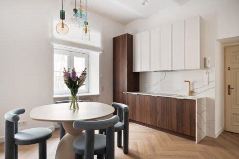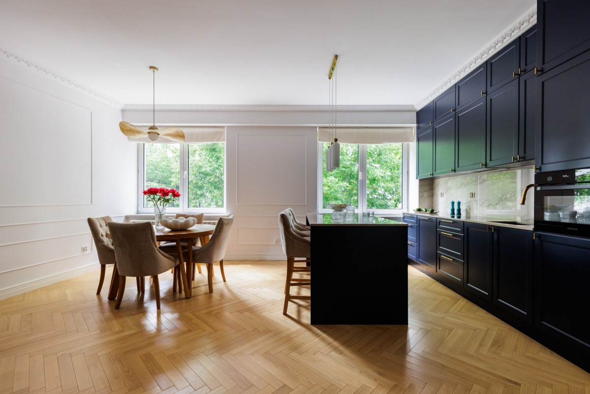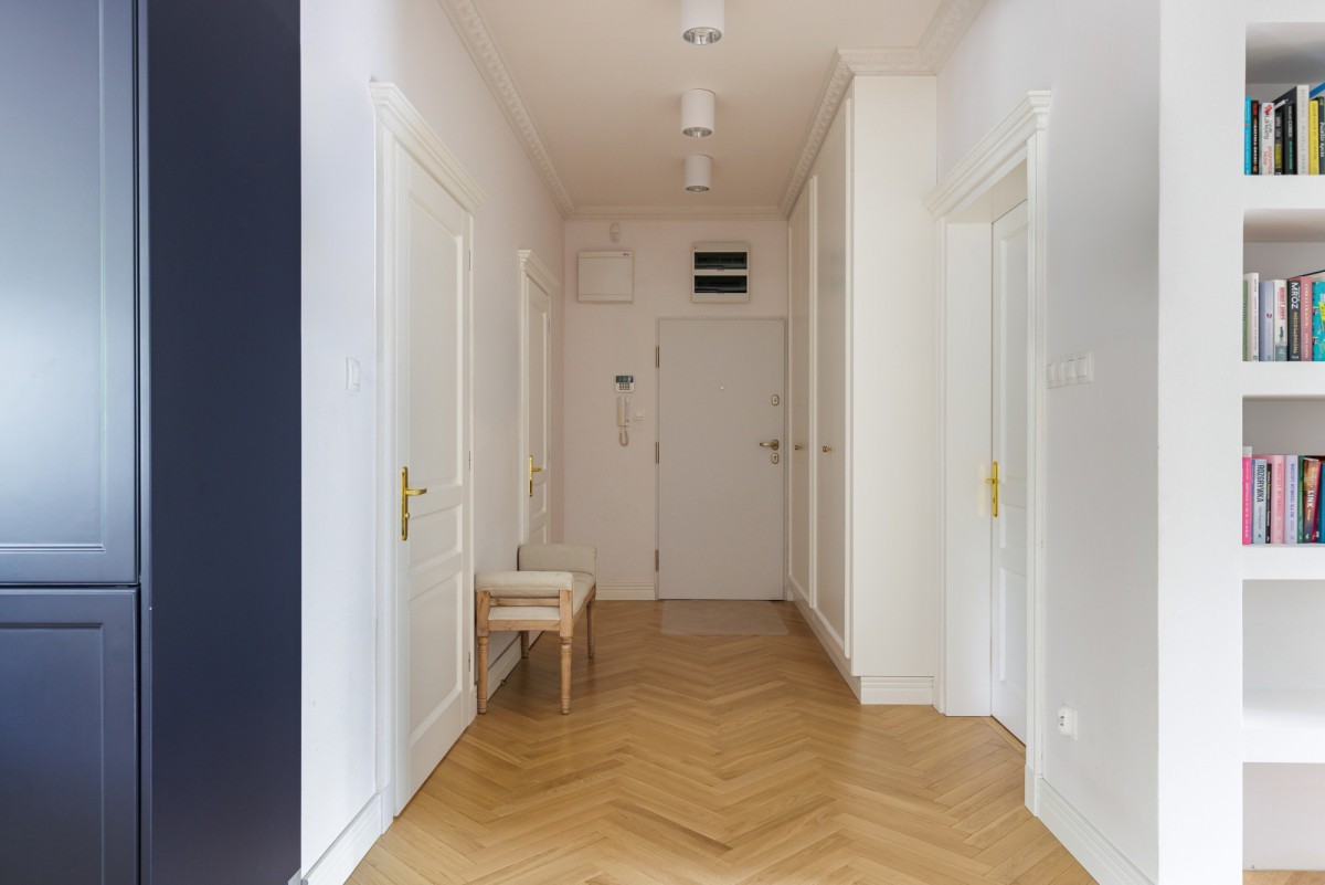 Wysokie sufity (blisko 3 metry) dodatkowo akcentują klimat mieszkania kamienicznego oraz dają poczucie przestrzeni.