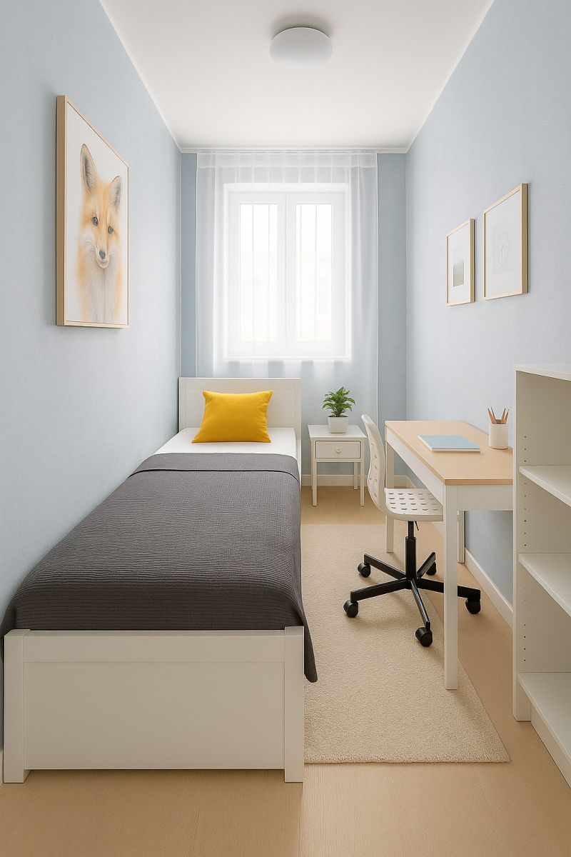 Pokój dla nastolatka – zdjęcie przedstawia wizualizację z łóżkiem i biurkiem. Prawdziwe zdjęcie przestawia pokój do zabawy dla małych dzieci z namiotem.