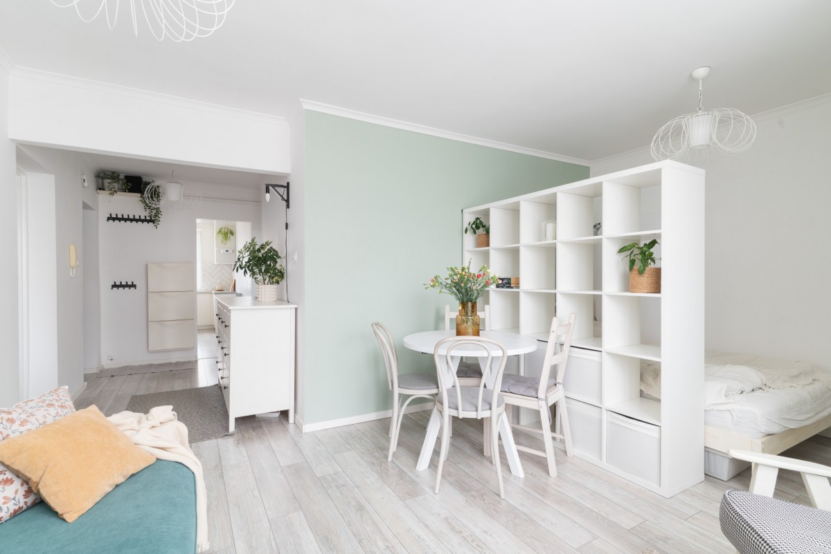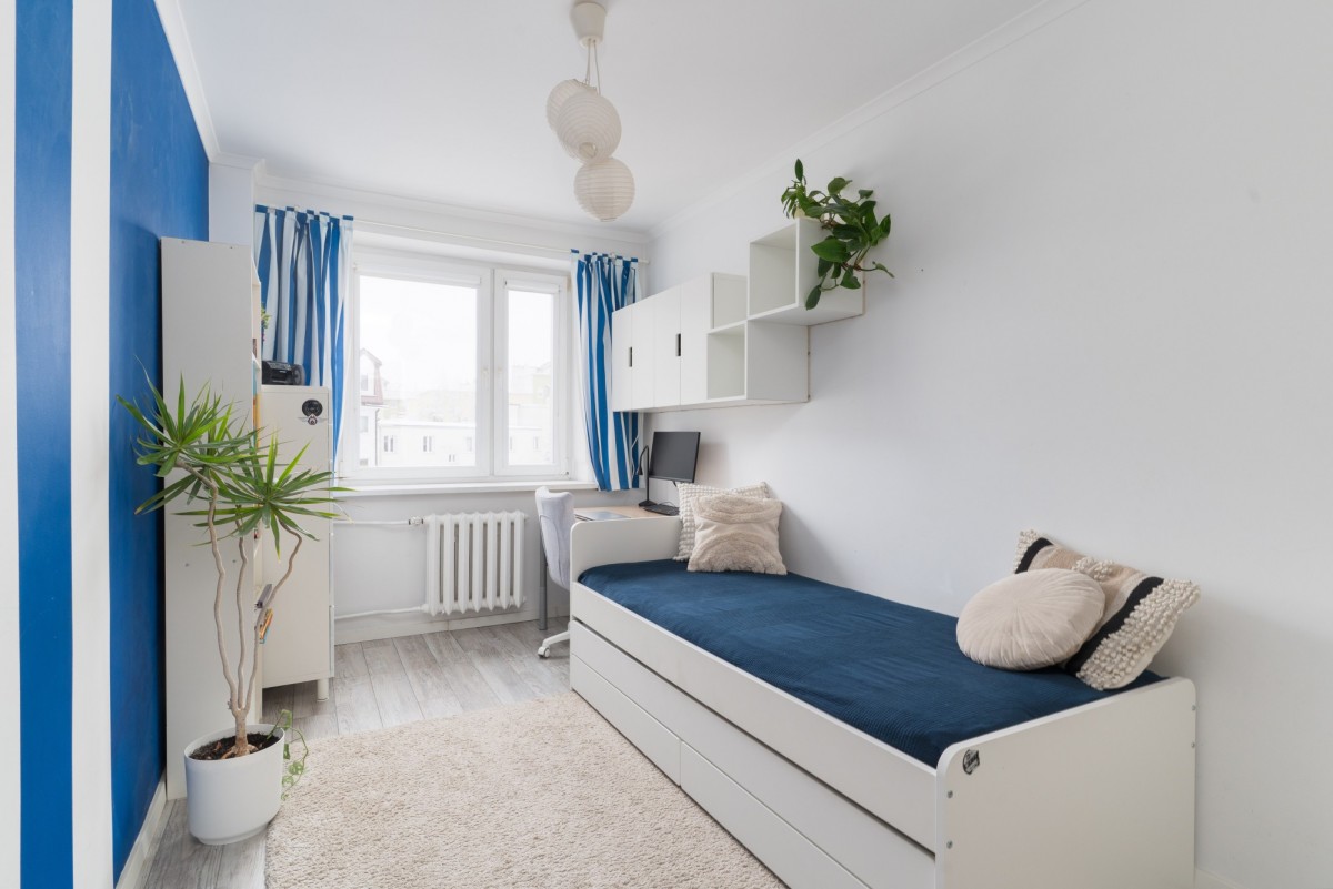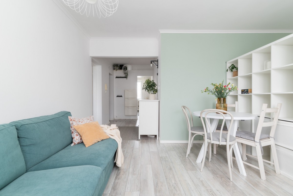 Aktualnie przemeblowany z wydzieloną strefą dzienną oraz strefą spania. Dzięki wyburzonej ściance przy wejściu salon zyskał dodatkową przestrzeń i jest niezwykle komfortowy oraz jasny.