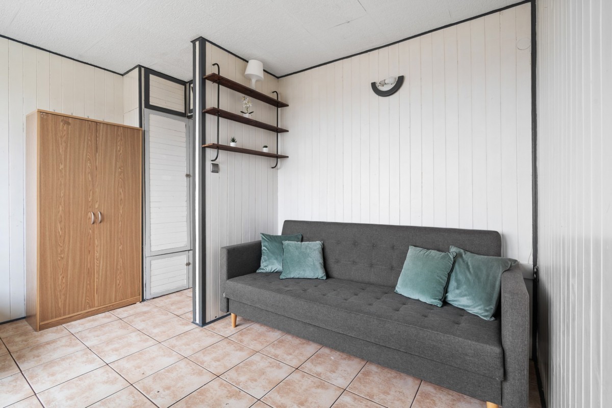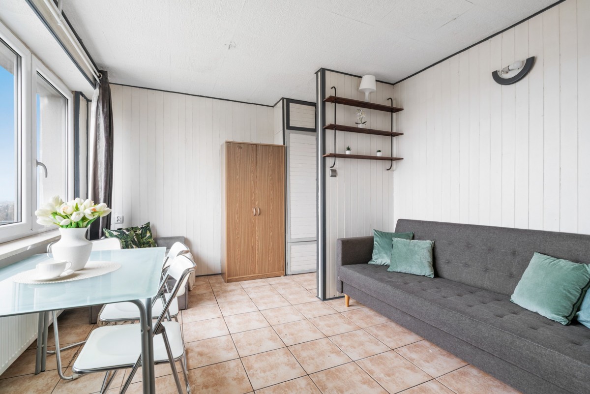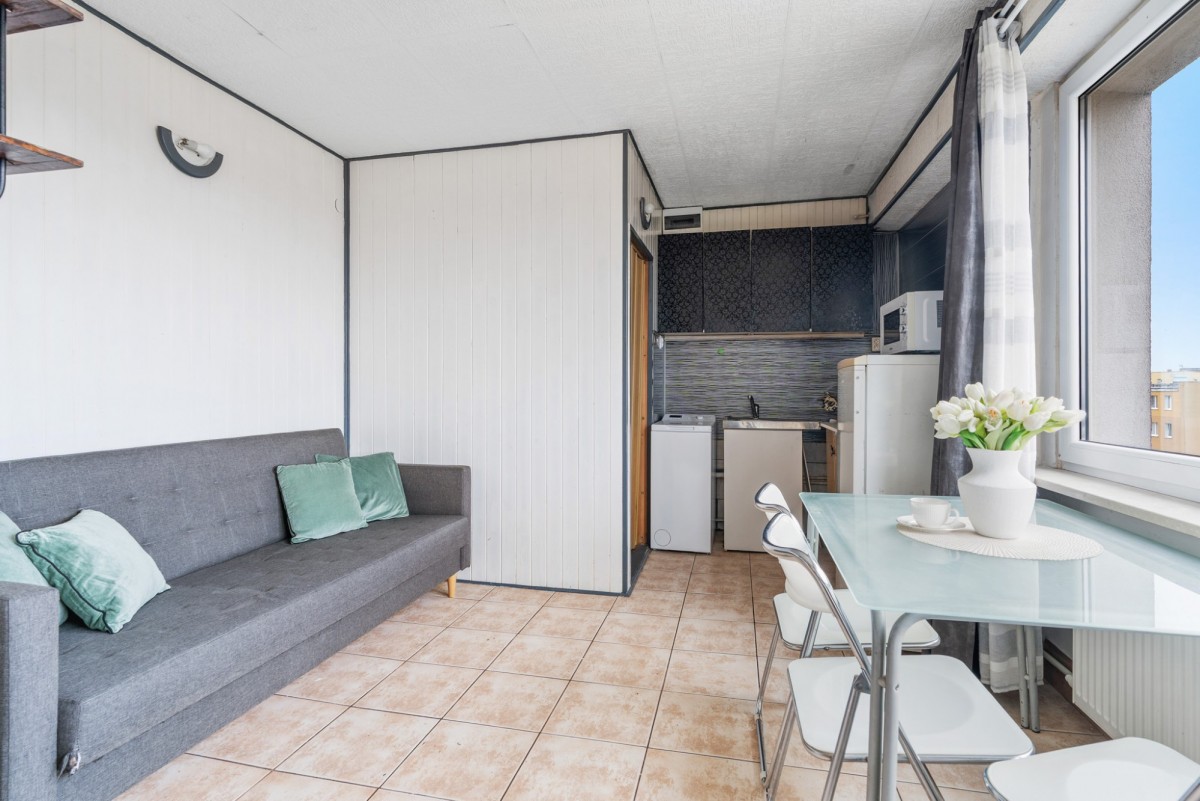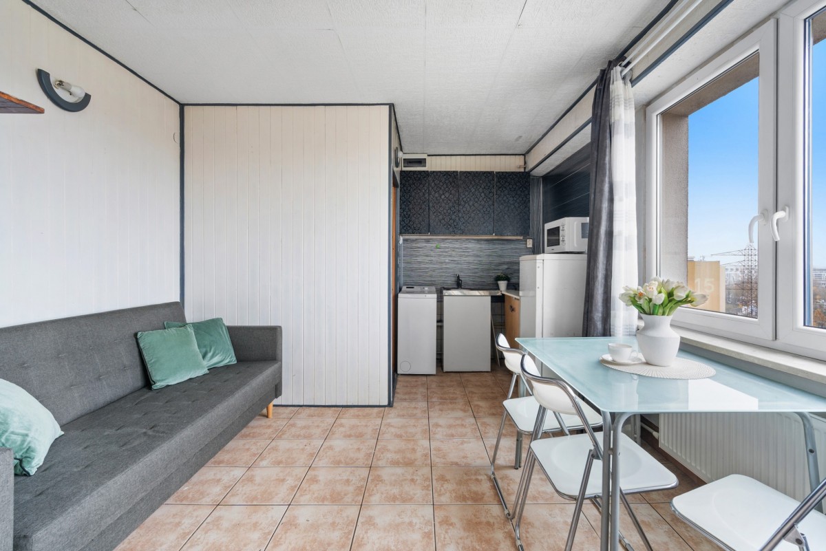 jasny, funkcjonalny pokój z aneksem kuchennym,