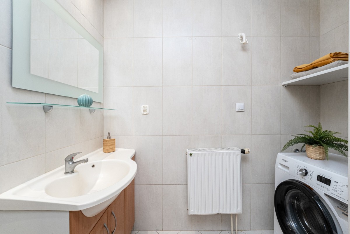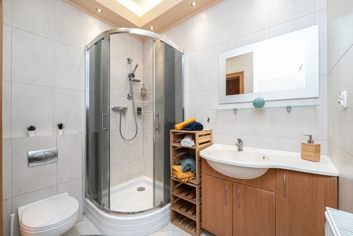 W łazience, której metraż wynosi 4,5m2, znajduje się kabina prysznicowa, WC, umywalka i pralka.