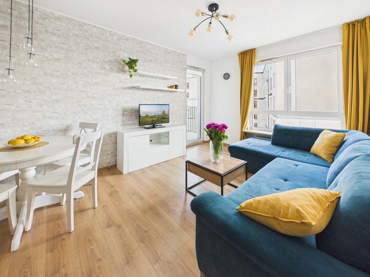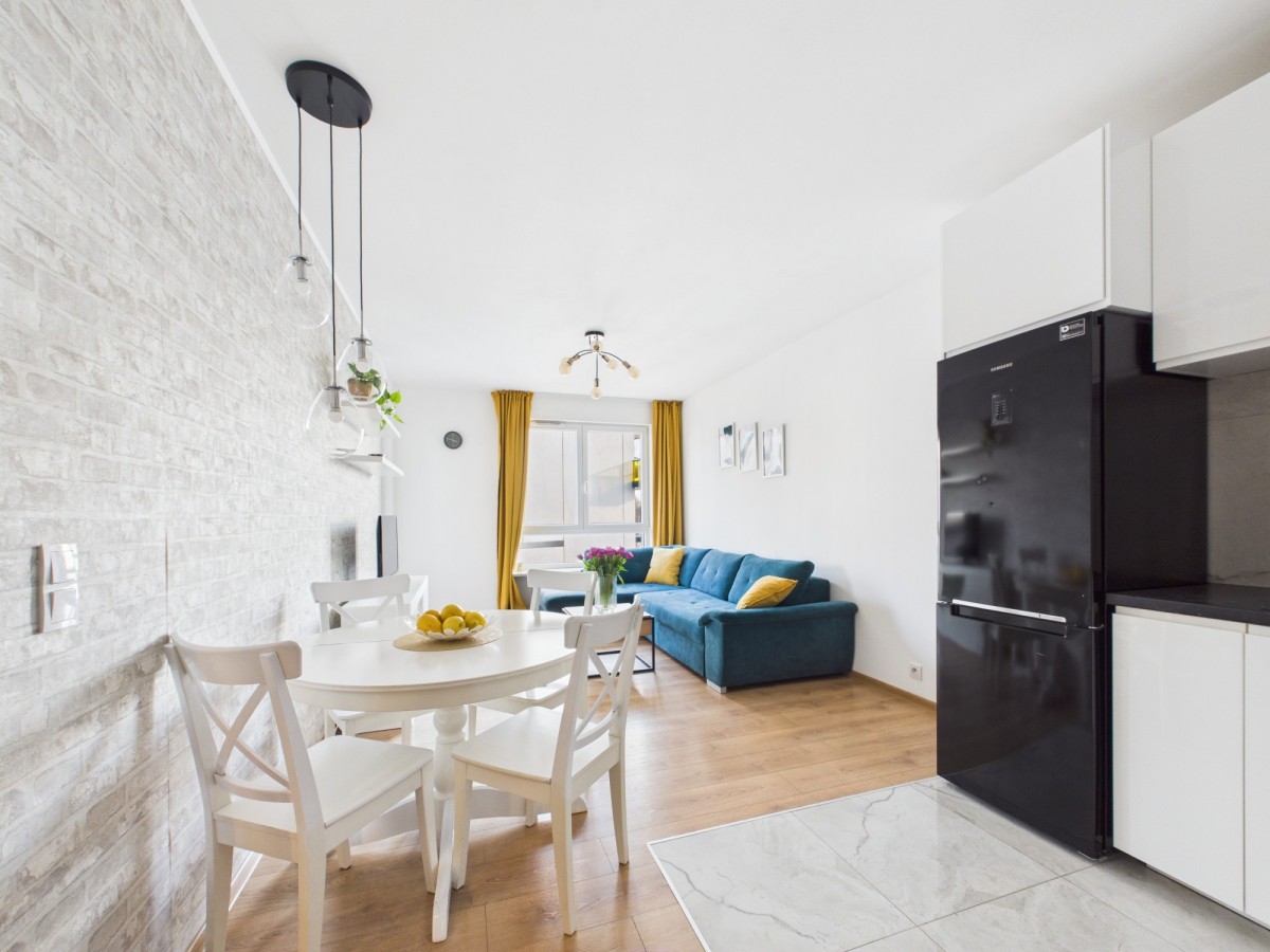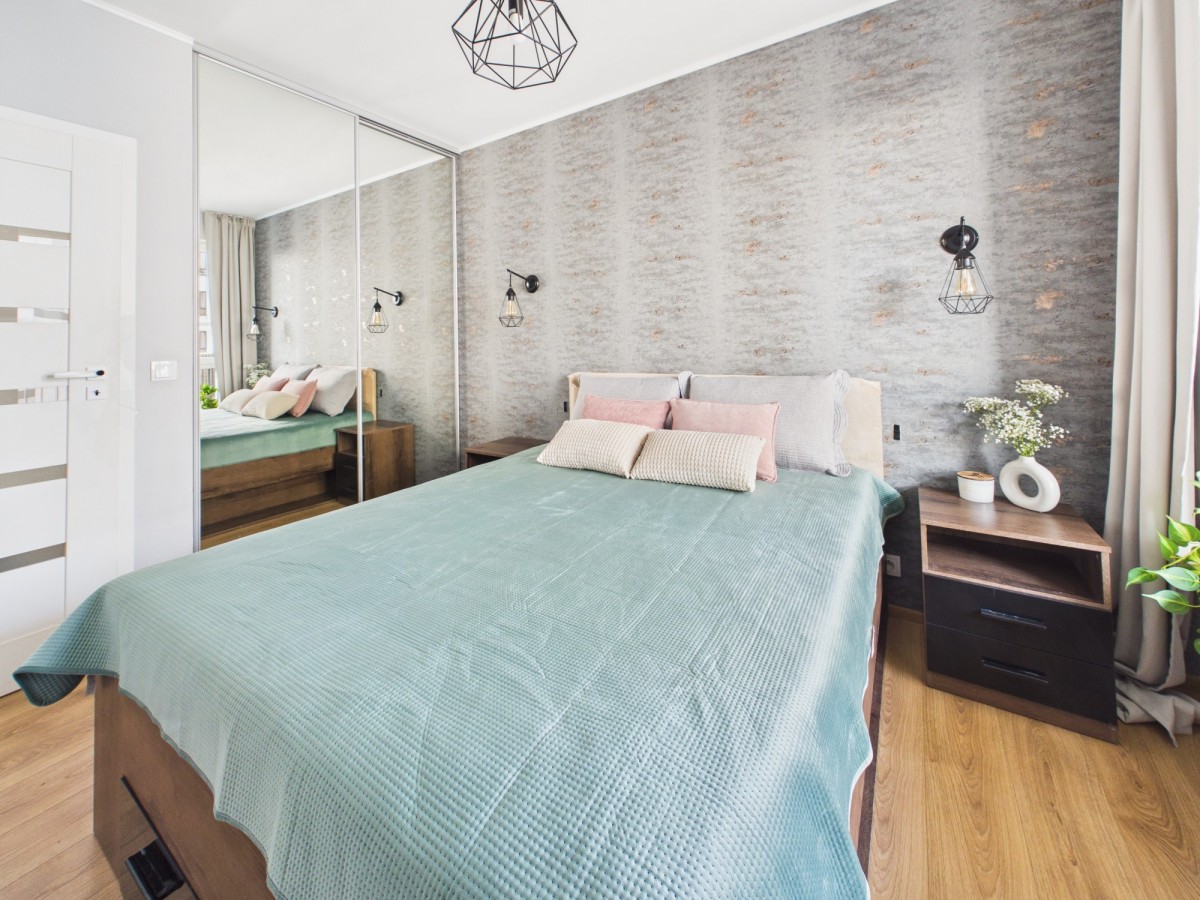 2- pokojowe mieszkanie o powierzchni 43,16 m2 znajduje się na 4 piętrze 6-piętrowego budynku z windą, jest w pełni umeblowane (sofa, stół, krzesła, łóżko, szafa) i wyposażone (zmywarka, pralka, lodówka, zamrażarka, piekarnik, okap).