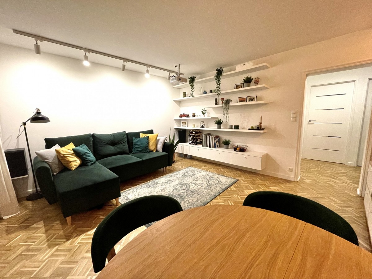 Przestrzeń 61,5 m² została zaprojektowana przez architekta wnętrz tak, by łączyć styl z codzienną funkcjonalnością. Parkiet po cyklinowaniu (2020) w świetnym stanie, a ściany o różnych strukturach, kolorystyka współgrająca ze sobą w całym mieszkaniu.