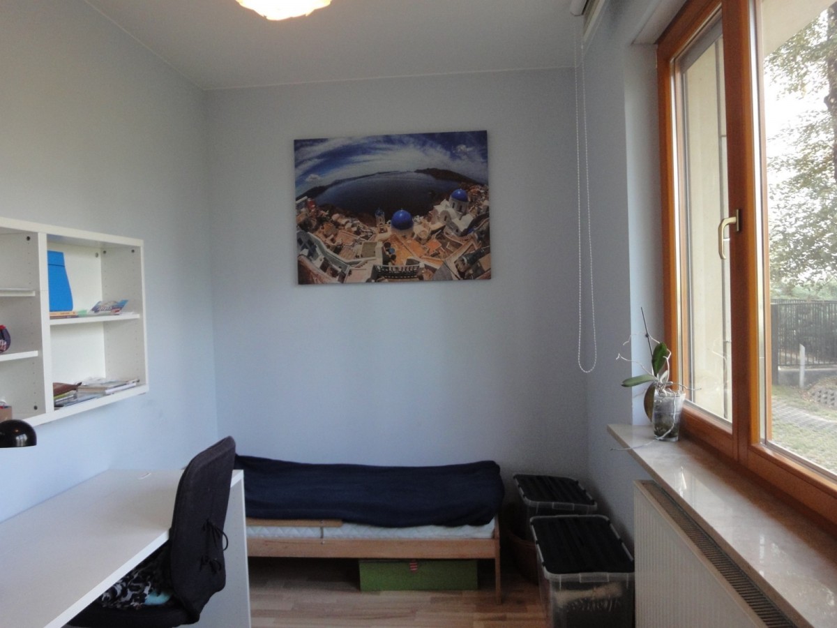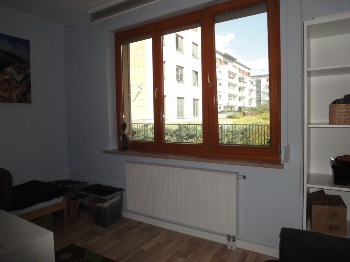 Szerzej – znajdziemy tu pokój dzienny z wyjściem na loggię, ogromną oddzielną kuchnię z miejscem na rodzinne posiłki (okna na zachód), trzy regularne sypialnie (wszystkie na wschód), łazienkę z wc (wanna ze szklanym parawanem), dodatkową oddzielną toaletę i przedpokój z niewielką garderobą.
