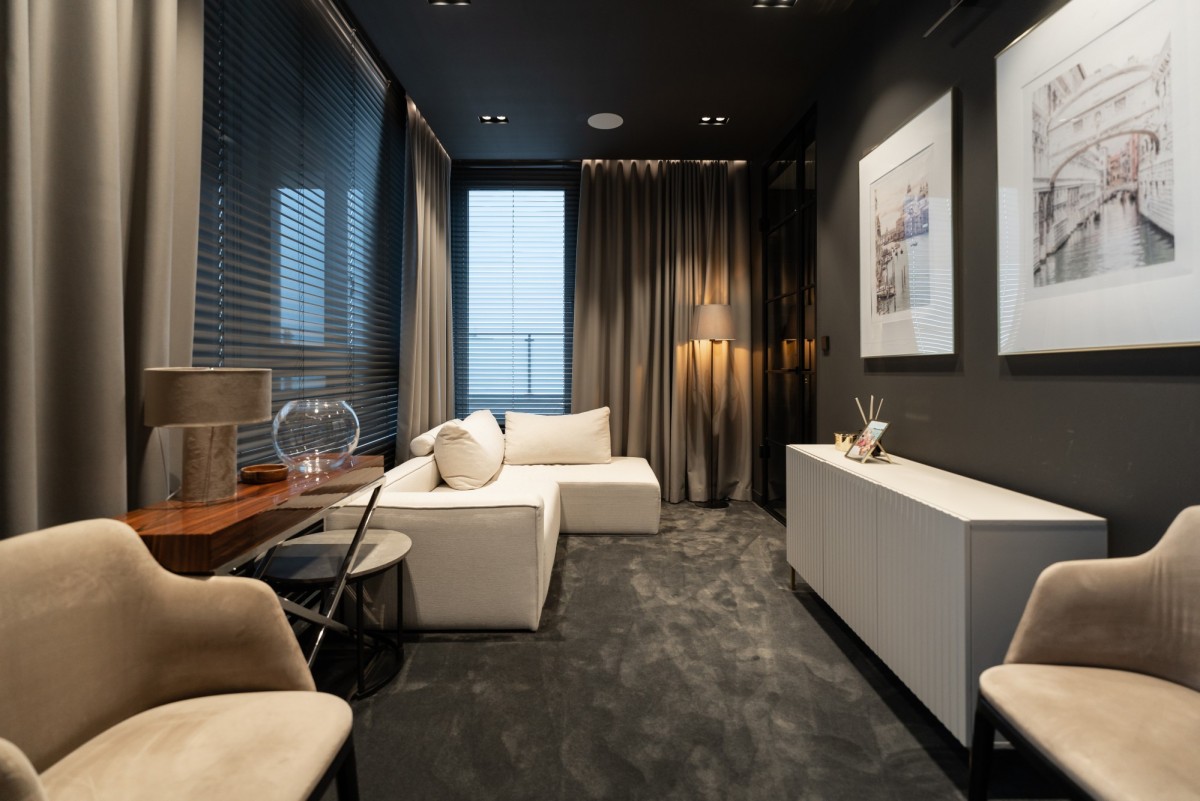 Całość wykończona z użyciem materiałów najwyższej jakości: naturalny dębowy parkiet, starannie dobrane przeszklenia, światowej klasy armatura i zabudowy stolarskie. Kolorystyka oparta na eleganckich szarościach, czerni i drewnie nadaje wnętrzu ponadczasowy charakter.