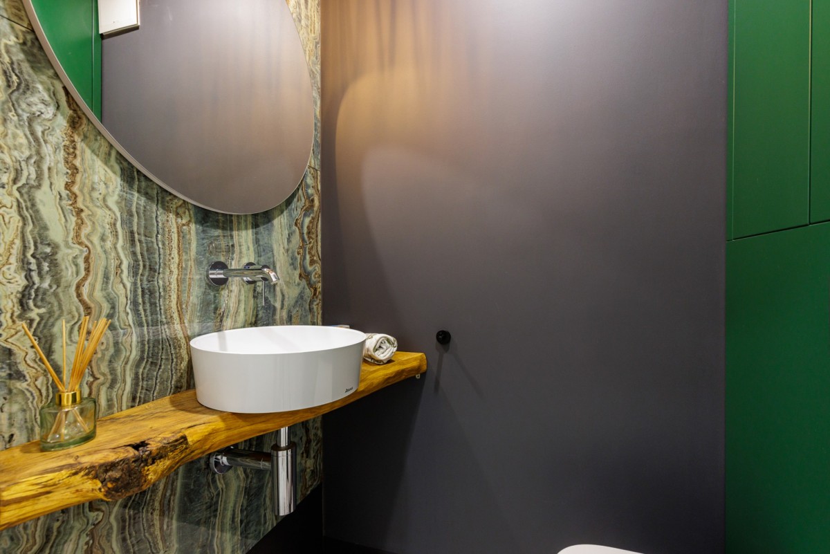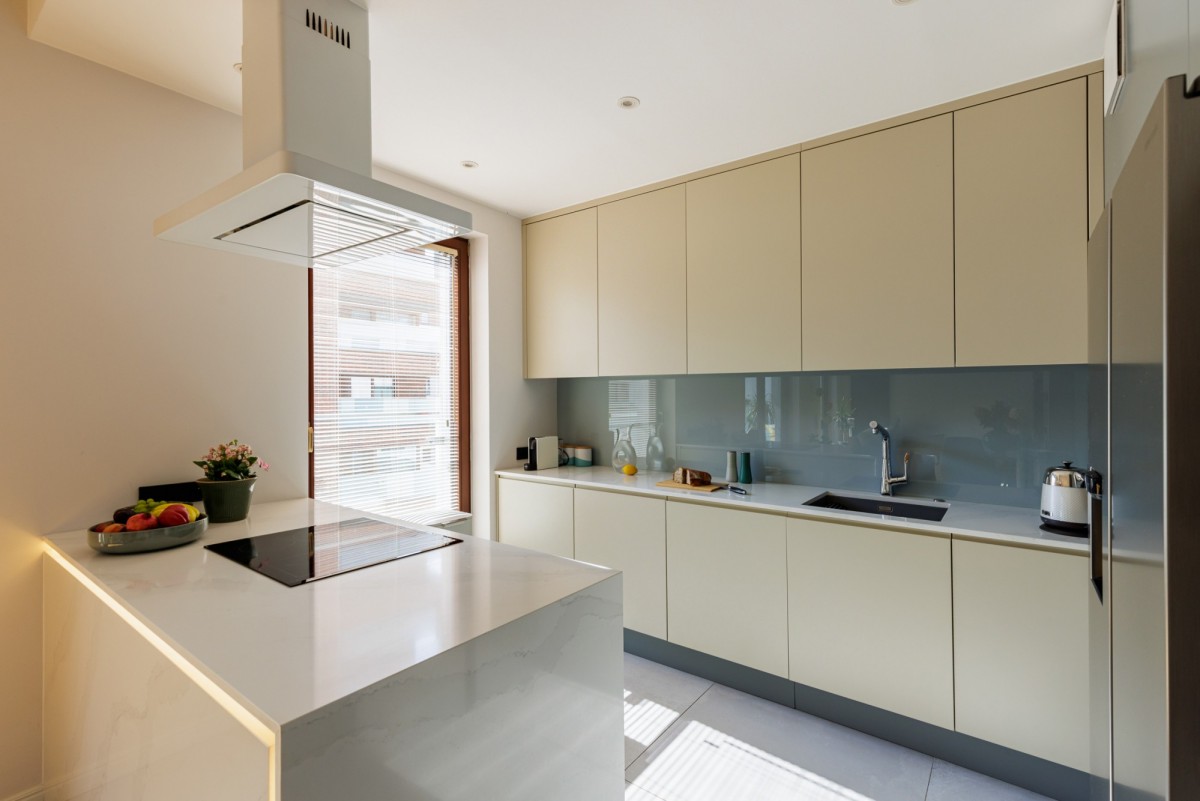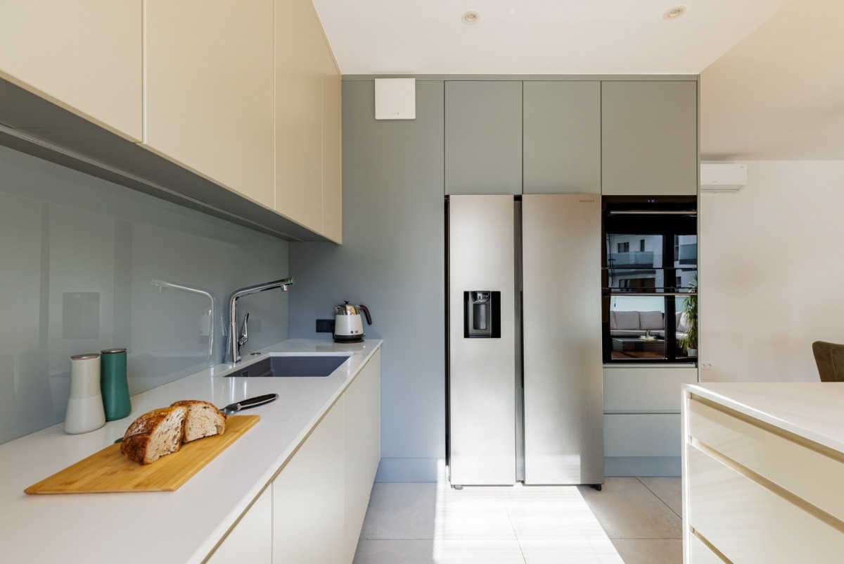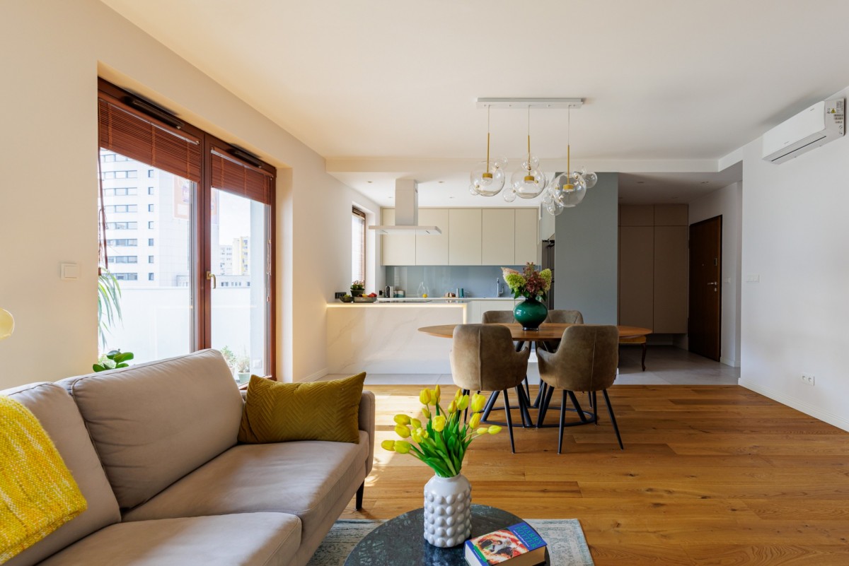 Centralnym punktem mieszkania jest przestronny salon połączony z aneksem kuchennym, który doskonale sprawdza się zarówno w codziennym użytkowaniu, jak i podczas spotkań z rodziną czy przyjaciółmi. W pełni wyposażona kuchnia zachwyca eleganckim wykończeniem – blat kwarcowy, fronty w połysku i macie, oraz kompletem nowoczesnego sprzętu AGD: lodówką z zamrażarką, płytą indukcyjną, piekarnikiem, zmywarką i okapem. Z salonu prowadzi wyjście na balkon, będący idealnym miejscem na poranną kawę lub chwilę relaksu po pracy.