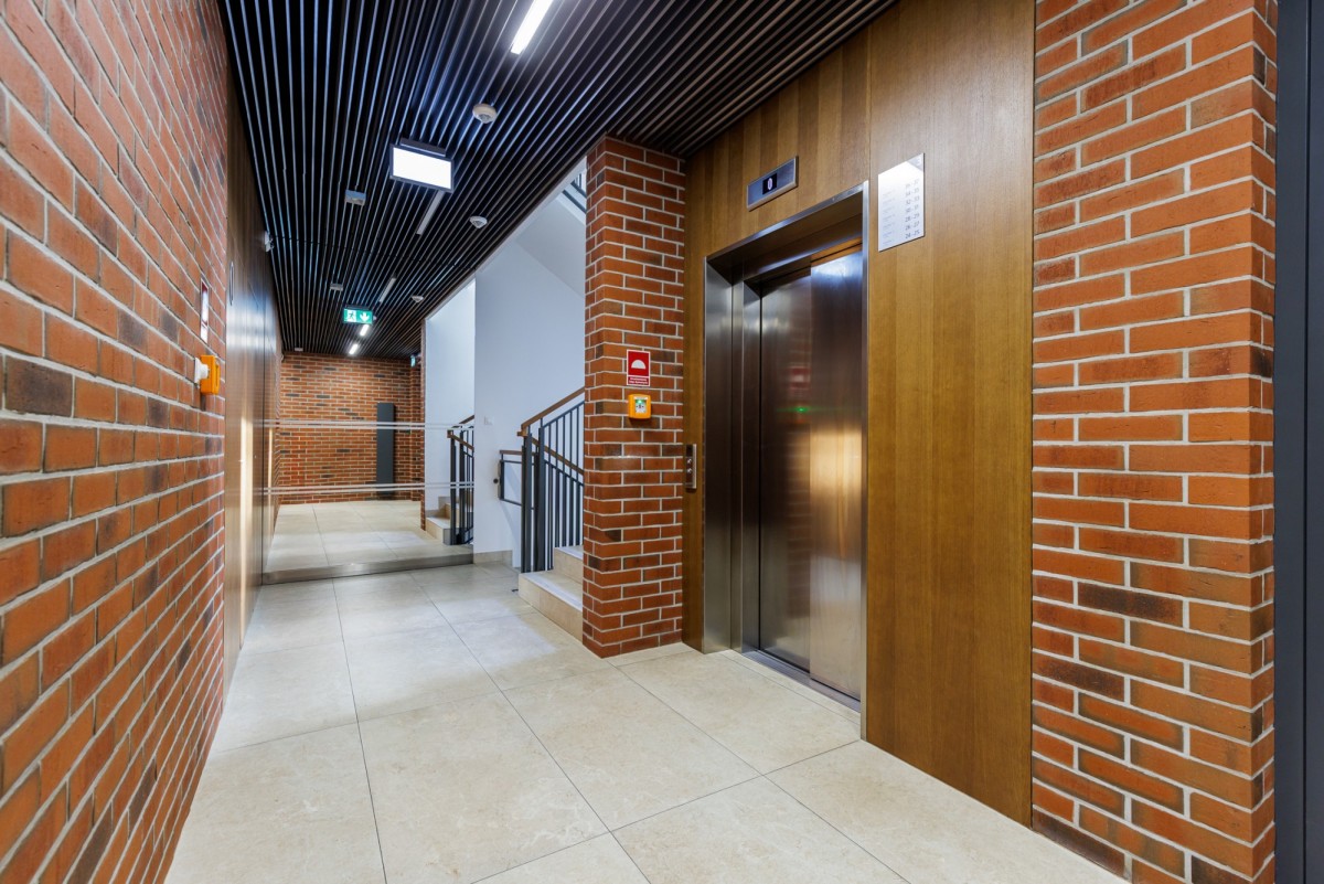 Klatki schodowe wykończone naturalnymi materiałami, podkreślające ekskluzywny charakter inwestycji.