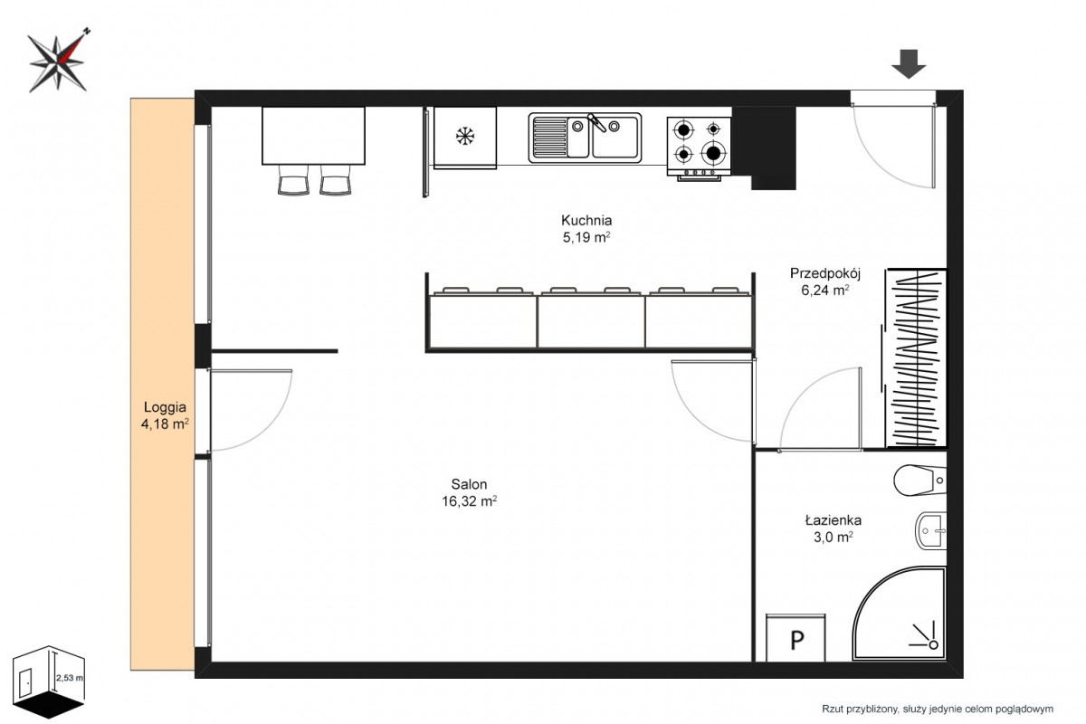 Wysokość pomieszczeń to 2,53 m. Mieszkanie środkowe o jednostronnej ekspozycji okien skierowanej na południowy-zachód.