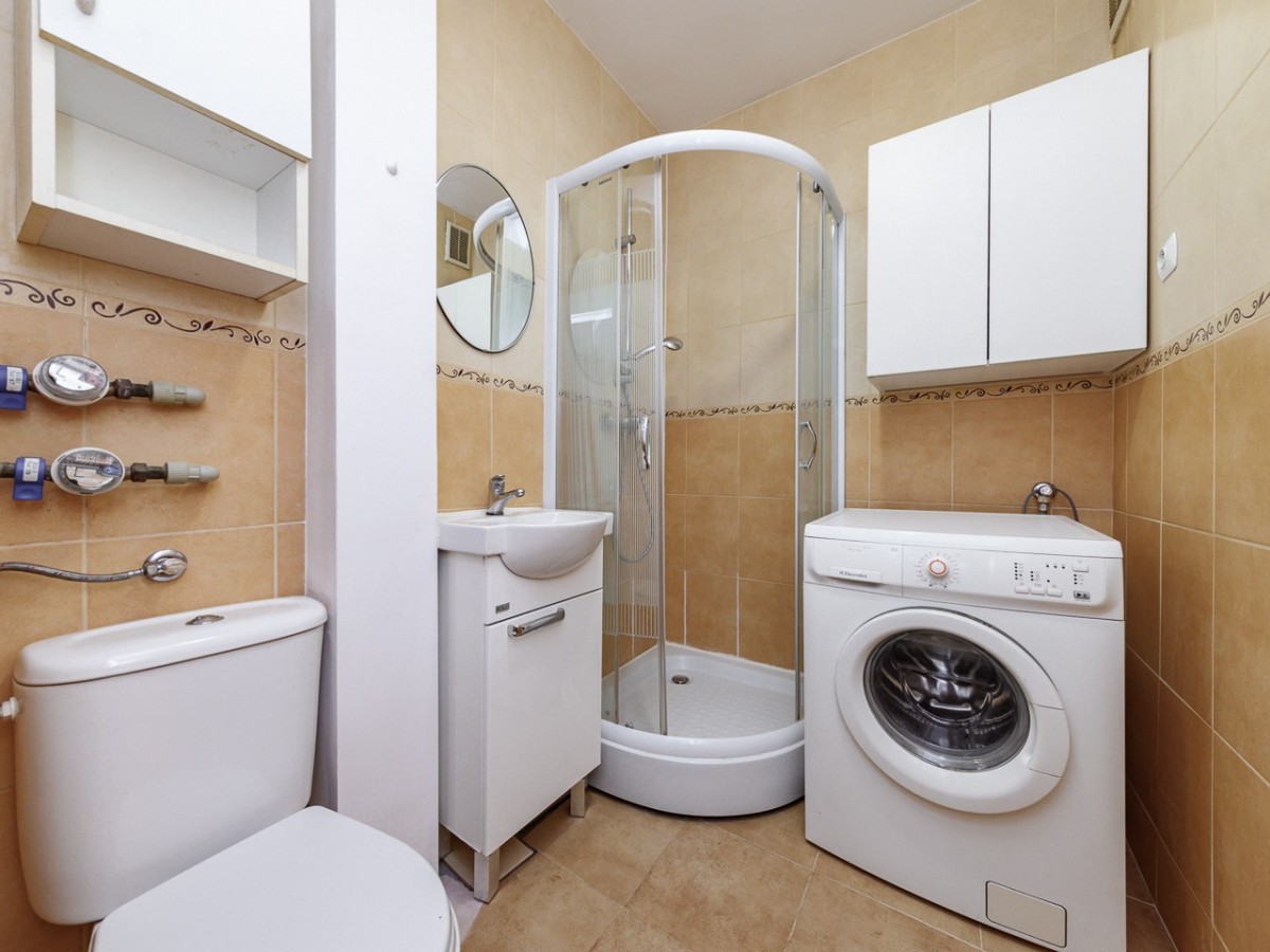 - ustawna kompaktowa łazienka z wc, w której zainstalowano m.in kabinę prysznicową, umywalkę oraz wyposażono w pralkę,