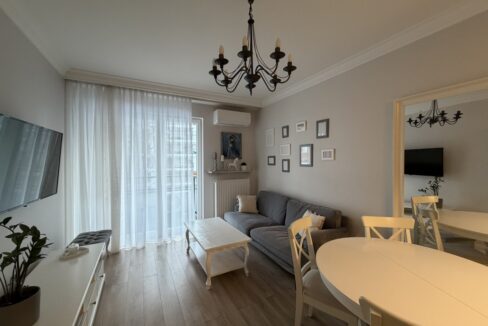 Kuchnia otwarta na prrzedpokój ze stałą zabudową: płyta indukcyjna, zmywarka, lodówka, piekarnik, kuchenka mikrofalowa, czajnik oraz pełne wyposażenie (talerze, sztućce, garnki itp.) W kuchni stolik z dwoma krzesłami. Salon umeblowany – rozkładana sofa, stolik oraz duża szafa wnękowa .. Przedpokój z wieszakami na odzież wierzchnią. Łazienka z wygodną kabiną prysznicową, umywalką, toaletą oraz pralką. W mieszkaniu domofon oraz sieć telewizji kablowej i internetu. Do lokalu przynależy duża piwnica.