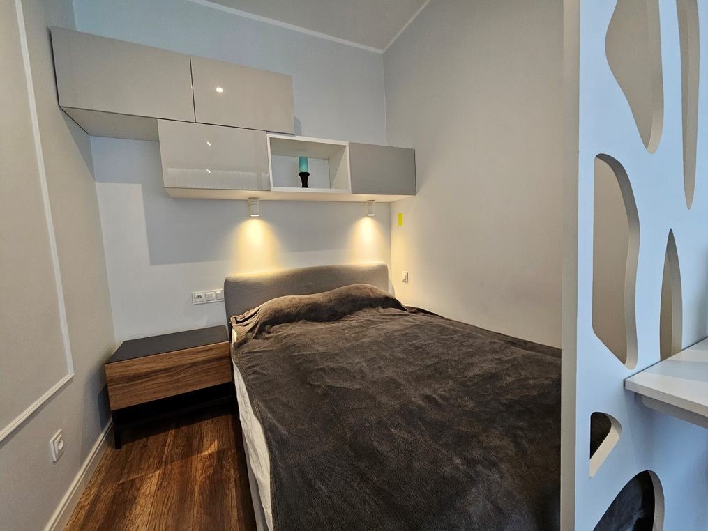 Salon z wydzieloną częścią sypialnianą – kanapa stolik biurko, telewizor, łóżko 140×200