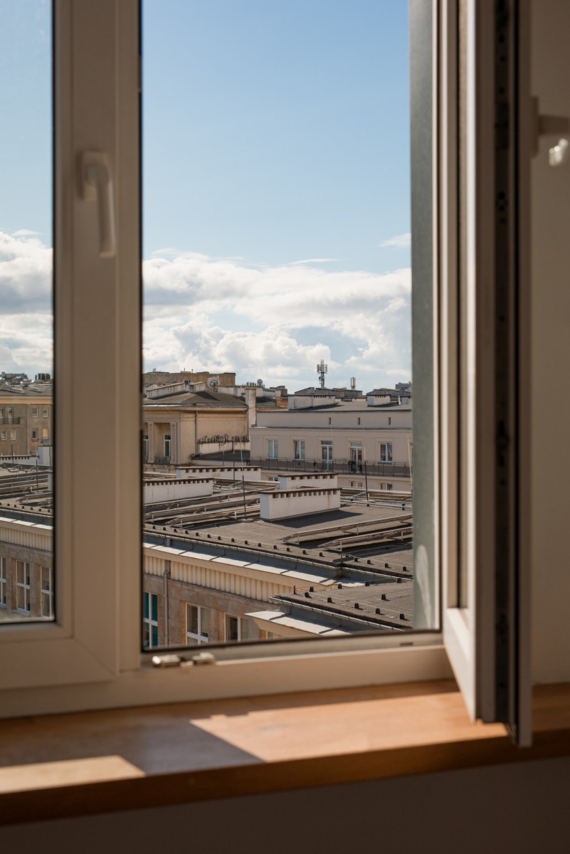 Mieszkanie jest dwustronne z pięknym widokiem na ciche patio i Aleję Wyzwolenia.