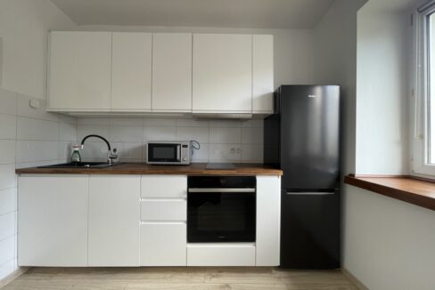 Mieszkanie jest umeblowane i wyposażone w AGD (stałe elementy w cenie, w tym zabudowa kuchenna, pozostałe wyposażenie do uzgodnienia).