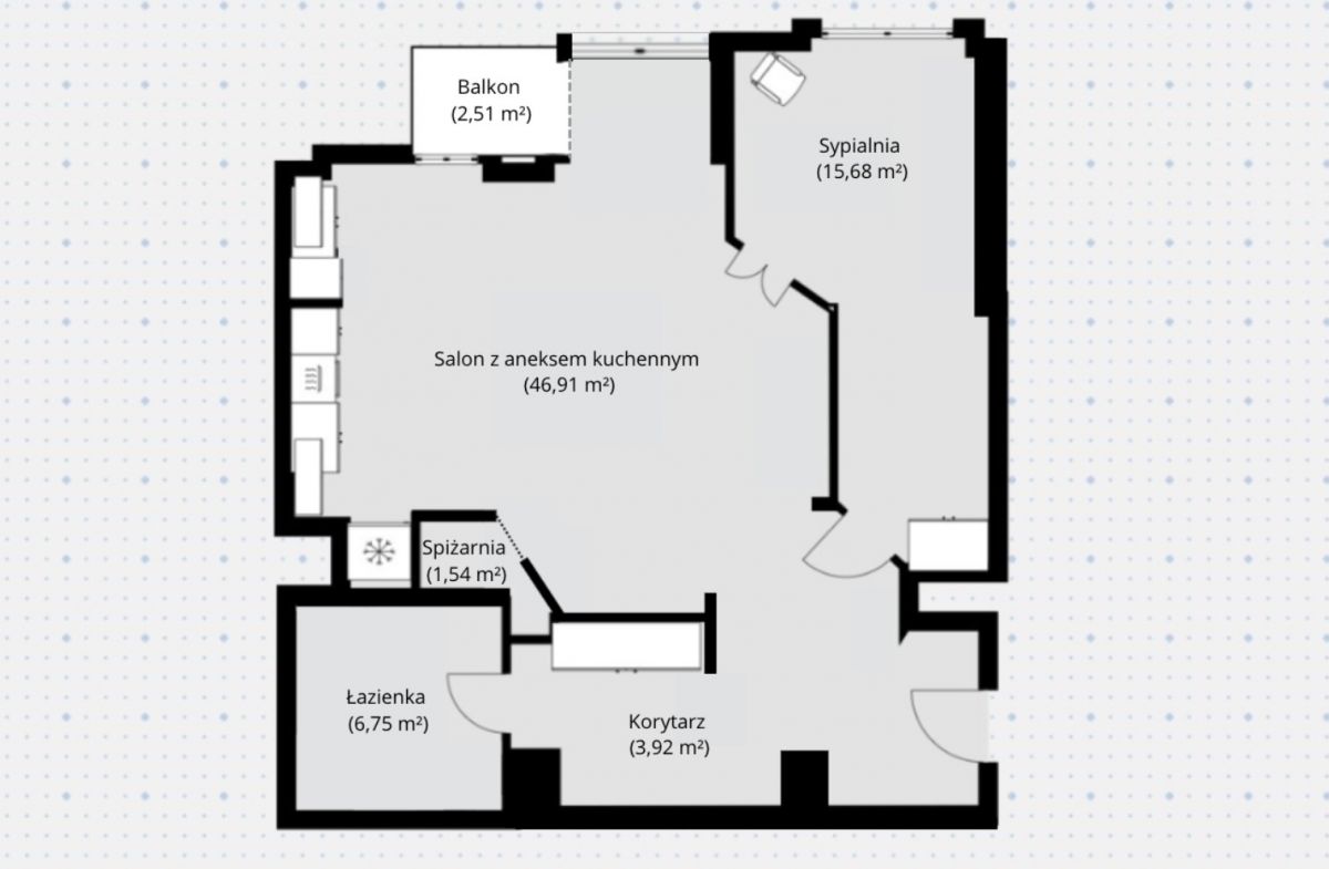 – salon z aneksem kuchennym, (46,91 m²) z wyjściem na balkon (2,51 m²),