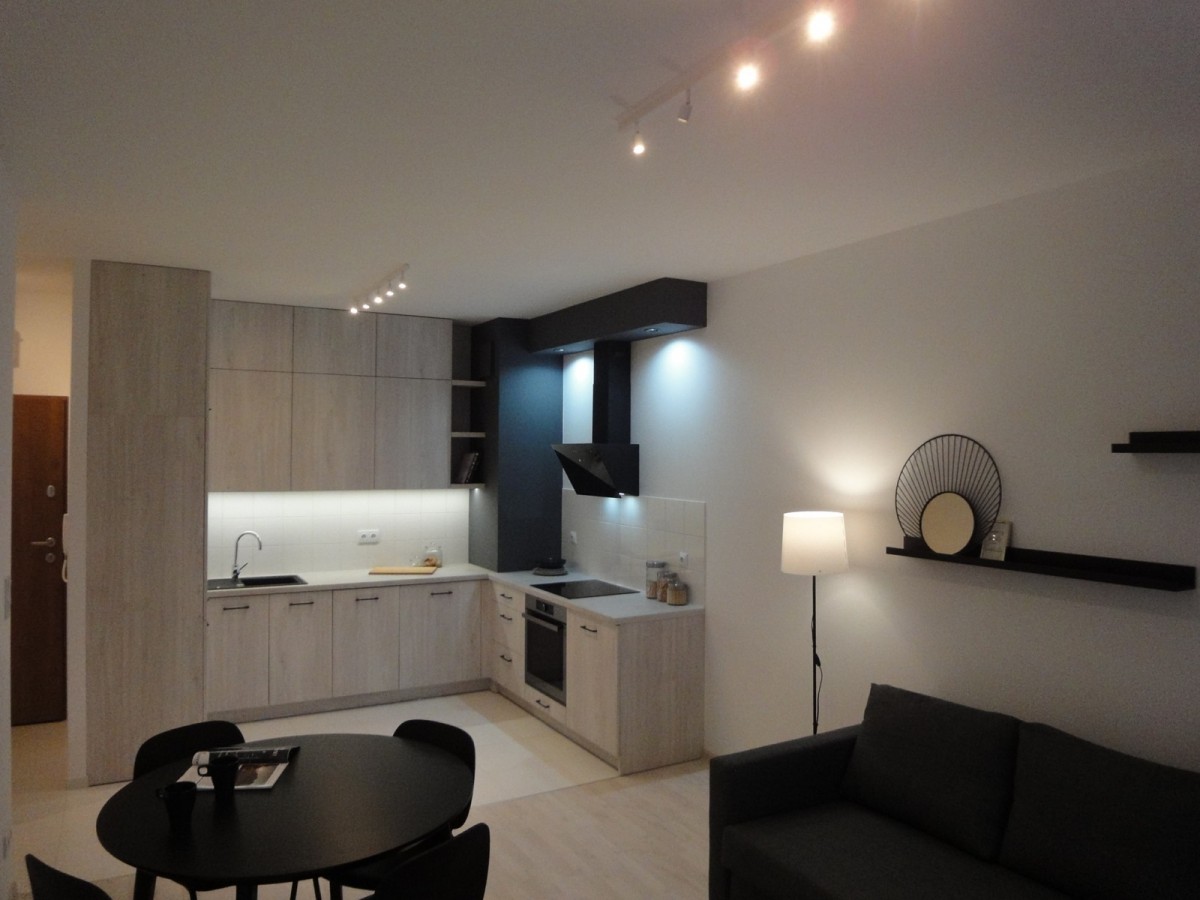 Mieszkanie znajduje się w nowym budynku, zostało niedawno wykończone i umeblowane nowymi meblami.